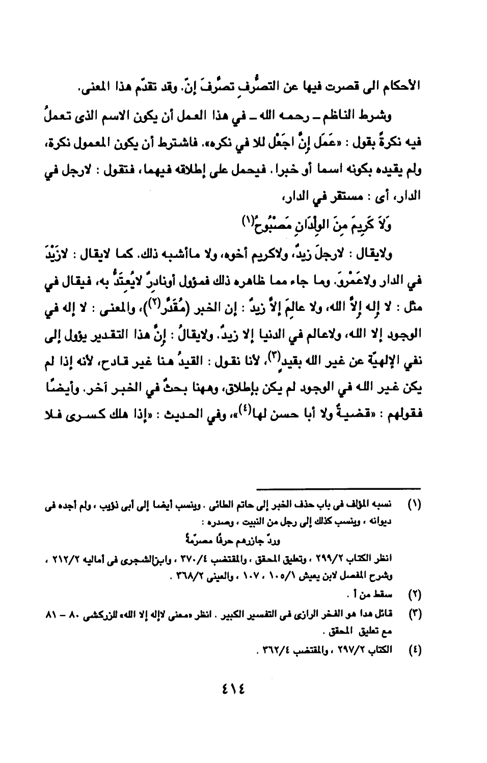 ولا يقال: لا رجلَ زيدٌ، ولا كريم أخوه، ولا ما أشبه ذلك. كما لا يقال: لا زَيْدَ في الدار ولا عَمْروَ. وما جاء مما ظاهره ذلك فمؤول أو نادِرٌ لا يُعِتَدُّ به، فيقال في مثل: لا إِله إِلّا الله، ولا عالِمَ إلّا زيدٌ: إن الخبر (مُقَدّر)، والمعنى: لا إله في الوجود إلا الله، ولا عالم في الدنيا إلا زيدٌ. ولا يقالُ: إِنّ هذا التقدير يؤول إلى نفي الإلهيّة عن غير الله بقيدٍ، لأنا نقول: القيدُ هنا غير قادح، لأنه إذا لم يكن غير الله في الوجود لم يكن بإطلاق، وههنا بحثٌ في الخبر آخر. وأيضًا فقولهم: «قضيةٌ ولا أبا حسن لها»، وفي الحديث: «إذا هلك كسرى فلا