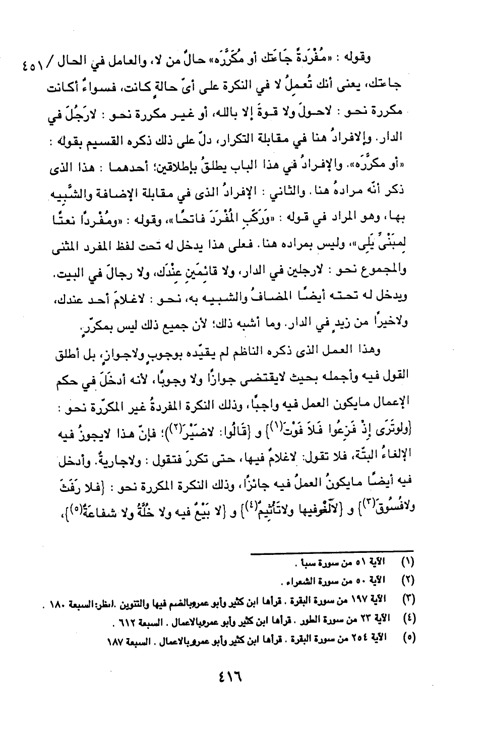 وهذا العمل الذى ذكره الناظم لم يقيّده بوجوبٍ ولا جوازٍ، بل أطلق القول فيه وأجمله بحيث لا يقتضى جوازًا ولا وجوبًا، لأنه أدخَلَ في حكم الإعمال ما يكون العمل فيه واجبًا، وذلك النكرة المفردةُ غير المكرّرة نحو: {ولو تَرَى إِذْ فَزِعُوا فَلَا فَوْتَ} و {قَالُوا: لا ضَيْرَ}؛ فإنّ هذا لا يجوزُ فيه الإلغاءُ البتّة، فلا تقول: لا غلامٌ فيها، حتى تكرر فتقول: ولا جاريةٌ. وأدخل فيه أيضًا ما يكونُ العملُ فيه جائزًا، وذلك النكرة المكررة نحو: {فلا رَفَثَ ولا فُسُوقَ} و {لا لَغْو فيها ولا تَأْثِيمٌ} و {لا بَيْعٌ فيه ولا خُلّةُ ولا شفاعَةٌ}،