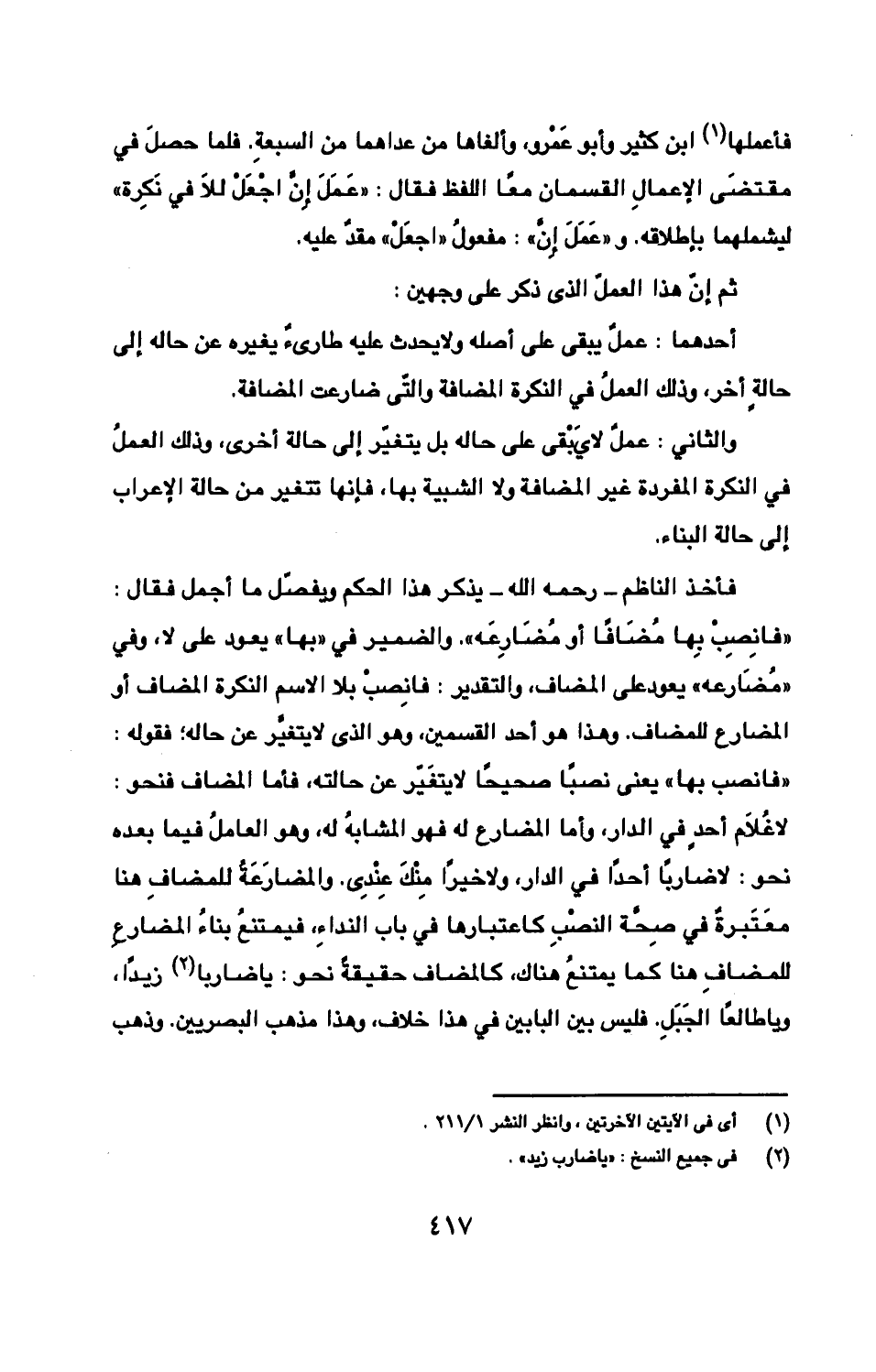 أحدهما: عملٌ يبقى على أصله ولا يحدث عليه طارئٌ يغيره عن حاله إلى حالةٍ أخر، وذلك العملُ في النكرة المضافة والّتى ضارعت المضافة.