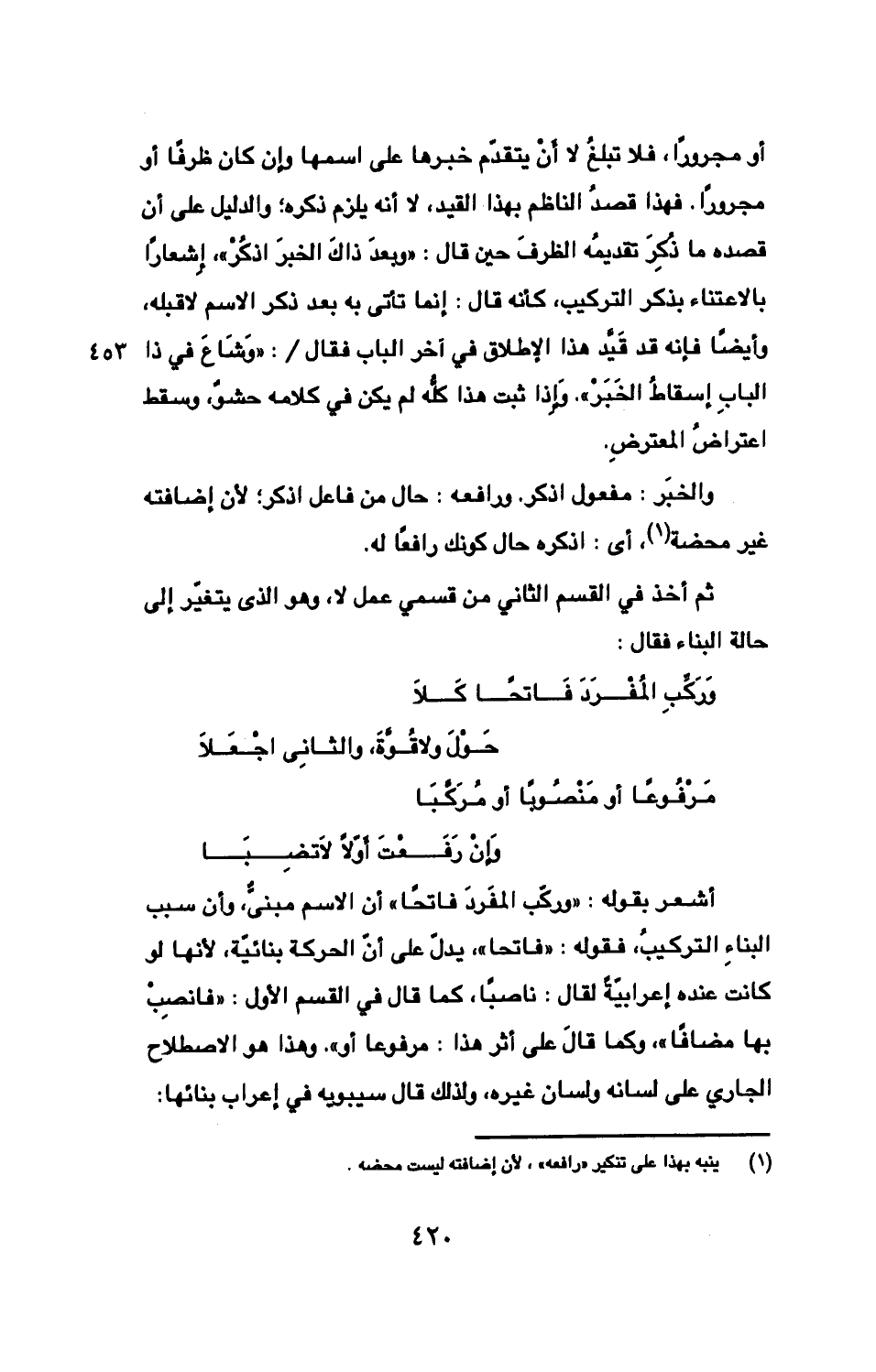 أشعر بقوله: «وركّب المفرَدَ فاتحًا» أن الاسم مبنىٌّ، وأن سبب البناءِ التركيبُ، فقوله: «فاتحا»، يدلّ على أنّ الحركة بنائيّة، لأنها لو كانت عنده إعرابيّة لقال: ناصبًا، كما قال في القسم الأول: «فانصِبْ بها مضافًا»، وكما قالَ على أثر هذا: مرفوعا أو». وهذا هو الاصطلاح الجاري على لسانه ولسان غيره، ولذلك قال سيبويه في إعراب بنائها: