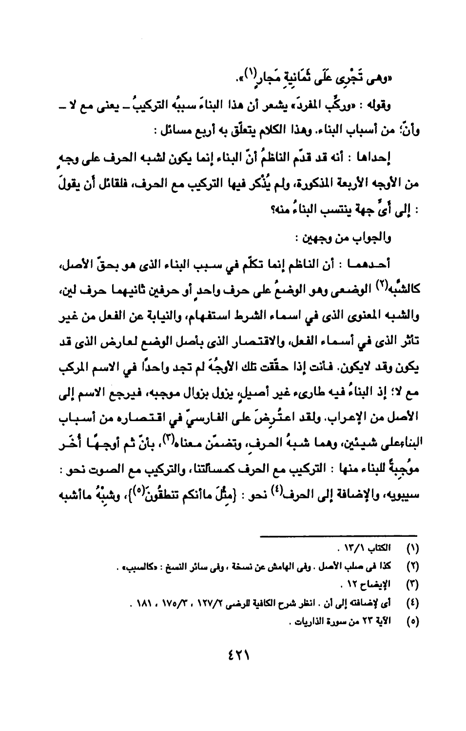 أحدهما: أن الناظم إنما تكلّم في سبب البناء الذى هو بحقّ الأصل، كالشّبه الوضعى وهو الوضعُ على حرف واحدٍ أو حرفين ثانيهما حرف لين، والشبه المعنوى الذى في اسماء الشرط استفهام، والنيابة عن الفعل من غير تأثر الذى في أسماء الفعل، والاقتصار الذى بأصل الوضع لعارض الذى قد يكون وقد لا يكون. فأنت إذا حقّقت تلك الأوجُهَ لم تجد واحدًا في الاسم المركب مع لا؛ إذ البناءُ فيه طارئ غير أصيلٍ، يزول بزوال موجبه، فيرجع الاسم إلى الأصل من الإعراب. ولقد اعتُرِضَ على الفارسيّ في اقتصاره من أسباب البناء على شيئين، وهما شبهُ الحرفِ، وتضمّن معناه، بأنّ ثم أوجهًا أُخَر موُجِبةٌ للبناء منها: التركيب مع الحرف كمسألتنا، والتركيب مع الصوت نحو: سيبويه، والإضافة إلى الحرف نحو: {مِثْلَ ما أنكم تنطقُونَ}، وشِبْهُ ما أشبه