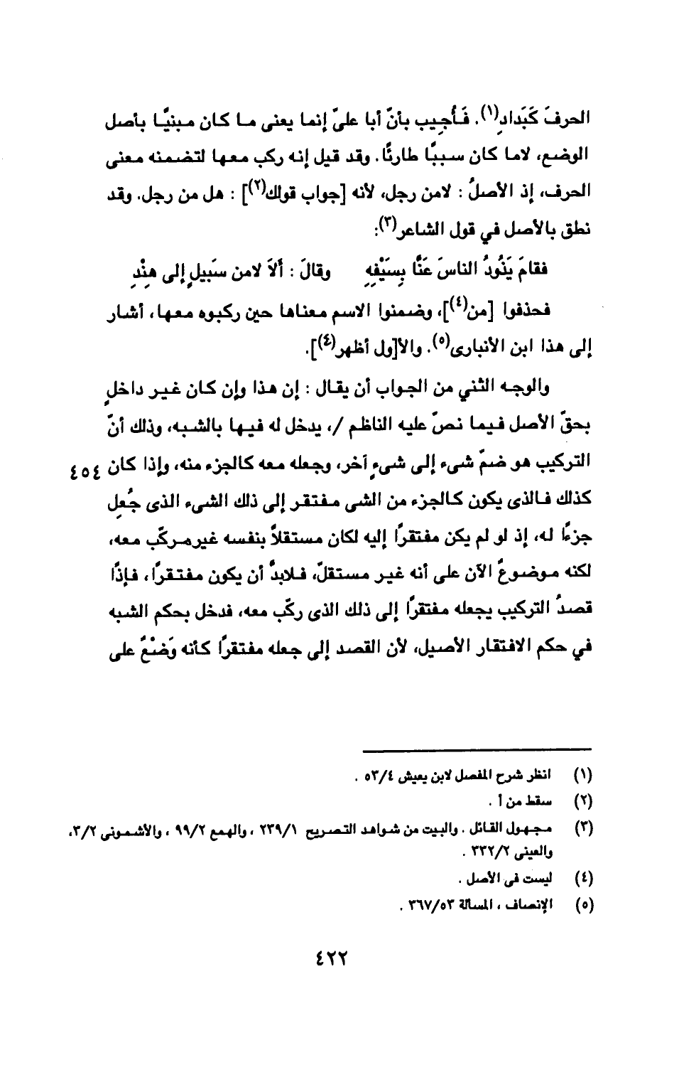 والوجه الثني من الجواب أن يقال: إن هذا وإن كان غير داخلٍ بحقّ الأصل فيما نصّ عليه الناظم/، يدخل له فيها بالشبه، وذلك أنّ التركيب هو ضمّ شئ إلى شئٍ آخر، وجعله معه كالجزء منه، وإذا كان كذلك فالذى يكون كالجزء من الشى مفتقر إلى ذلك الشئ الذي جُعِل جزءًا له، إذ لو لم يكن مفتقرًا إليه لكان مستقلًا بنفسه غير مركّب معه، لكنه موضوعٌ الآن على أنه غير مستقلّ، فلا بدّ أن يكون مفتقرًا، فإذًا قصدُ التركيب يجعله مفتقرًا إلى ذلك الذى ركّب معه، فدخل بحكم الشبه في حكم الافتقار الأصيل، لأن القصد إلى جعله مفتقرًا كأنه وَضْعٌ على