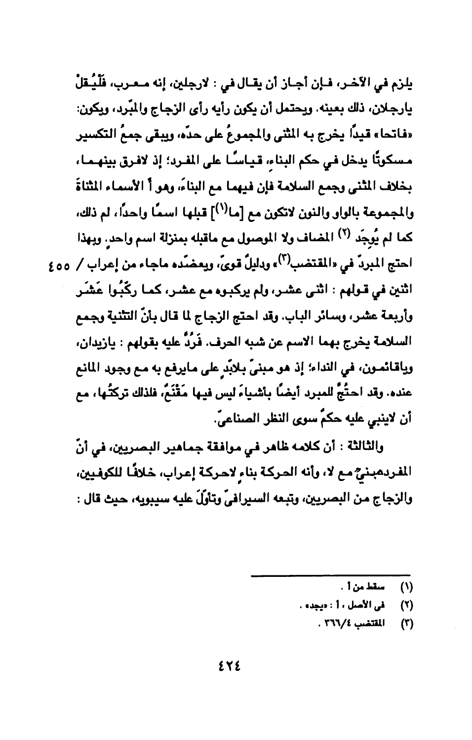 يلزم في الآخر، فإن أجاز أن يقال في: لا رجلين، إنه معرب، فَلْيقلْ يا رجلان، ذلك بعينه. ويحتمل أن يكون رأيه رأى الزجاج والمبرّد، ويكون: «فاتحا» قيدًا يخرج به المثنى والمجموعُ على حدّه، ويبقى جمعُ التكسير مسكوتًا يدخل في حكم البناءِ، قياسًا على المفرد؛ إذ لا فرق بينهما، بخلاف المثنى وجمع السلامة فإن فيهما مع البناءَ، وهو أالأسماء المثناةَ والمجموعة بالواو والنون لا تكون مع [ما] قبلها اسمًا واحدًا، لم ذلك، كما لم يُوجَدَ المضاف ولا الموصول مع ما قبله بمنزلة اسم واحدٍ. وبهذا احتج المبرّد في «المقتضب» ودليلٌ قوىّ، ويعضّده ما جاء من إعراف/ اثنين في قولهم: اثنى عشر، ولم يركبوه مع عشر، كما ركّبُوا عَشَر وأربعة عشر، وسائر الباب. وقد احتج الزجاج لما قال بأنّ التثنية وجمع السلامة يخرج بهما الاسم عن شبه الحرف. فَرُدّ عليه بقولهم: يا زيدان، ويا قائمون، في النداء؛ إذ هو مبنىّ بلا بدٍّ على ما يرفع به مع وجود المانع عنده. وقد احتُجّ للمبرد أيضًا بأشياءَ ليس فيها مَقْنَعٌ، فلذلك تركتُها، مع أن لا ينبي عليه حكمٌ سوى النظر الصناعىّ.