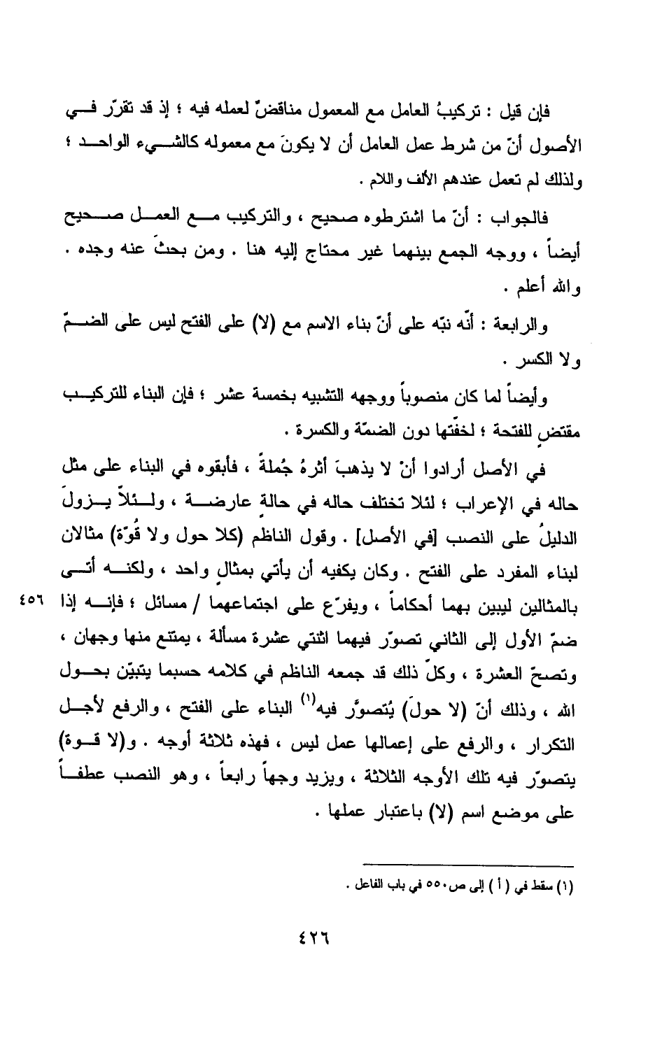 فإن قيل: تركيبُ العامل مع المعمول مناقضٌ لعمله فيه؛ إذ قد تقرّر في الأصول أنّ من شرط عمل العامل أن لا يكونَ مع معموله كالشئ الواحد؛ ولذلك لم تعمل عندهم الألف واللام.