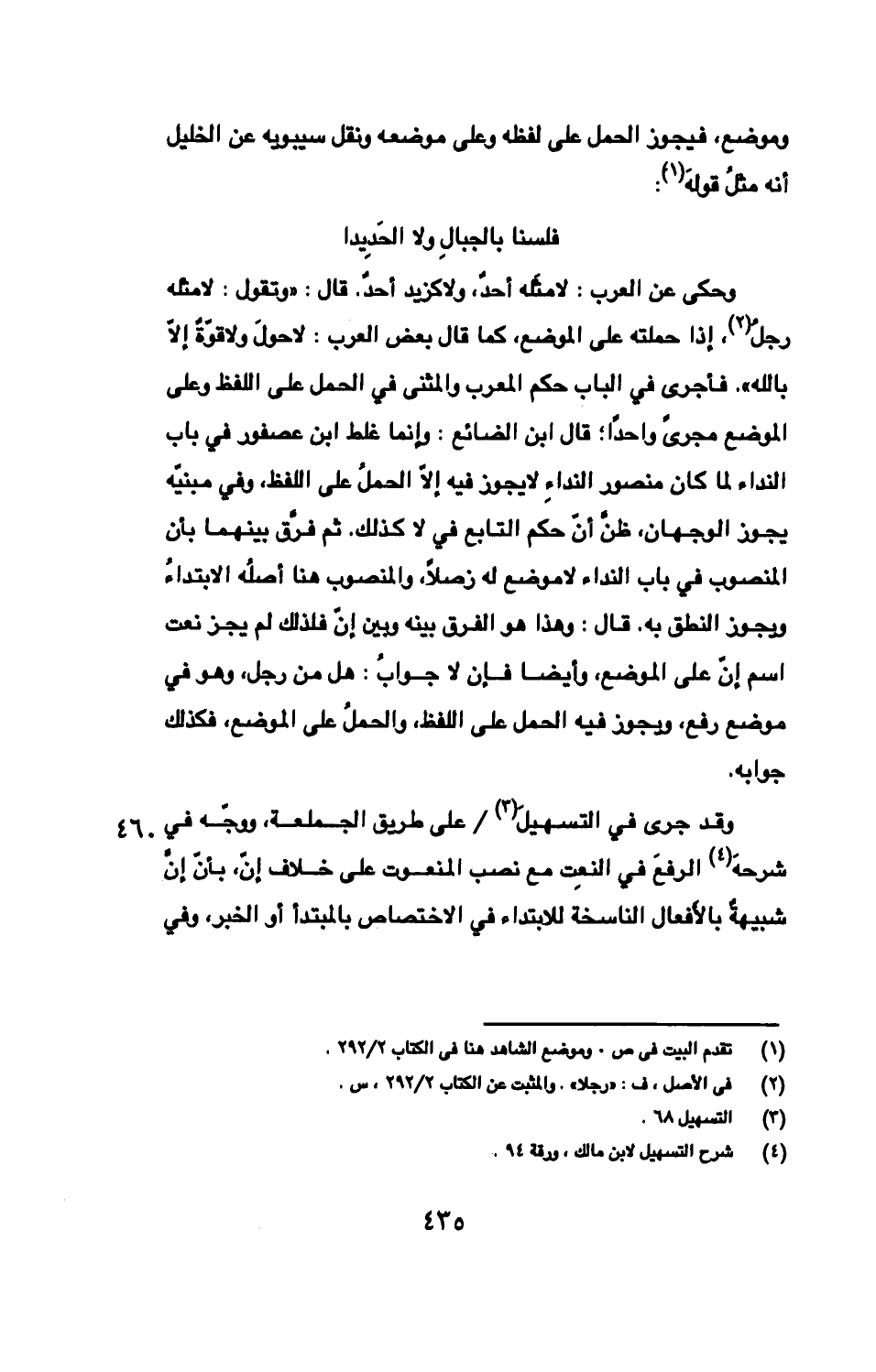 وحكى عن العرب: لا مثلَه أحدٌ، ولا كزيد أحدٌ. قال: «وتقول: لا مثله رجلٌ، إذا حملته على الموضع، كما قال بعض العرب: لا حولَ ولا قوّةٌ إلّا بالله». فأجرى في الباب حكم المعرب والمثنى في الحمل على اللفظ وعلى الموضع مجرىً واحدًا؛ قال ابن الضائع: وإنما غلط ابن عصفور في باب النداء لما كان منصور النداءِ لا يجوز فيه إلّا الحملُ على اللفظ، وفي مبنيّه يجوز الوجهان، ظنّ أنّ حكم التابع في لا كذلك. ثم فرّق بينهما بأن المنصوب في باب النداء لا موضع له زصلًا، والمنصوب هنا أصلُه الابتداءُ ويجوز النطق به. قال: وهذا هو الفرق بينه وبين إنّ فلذلك لم يجز نعت اسم إنّ على الموضع، وأيضا فإن لا جوابُ: هل من رجل، وهو في موضع رفع، ويجوز فيه الحمل على اللفظ، والحملُ على الموضع، فكذلك جوابه.