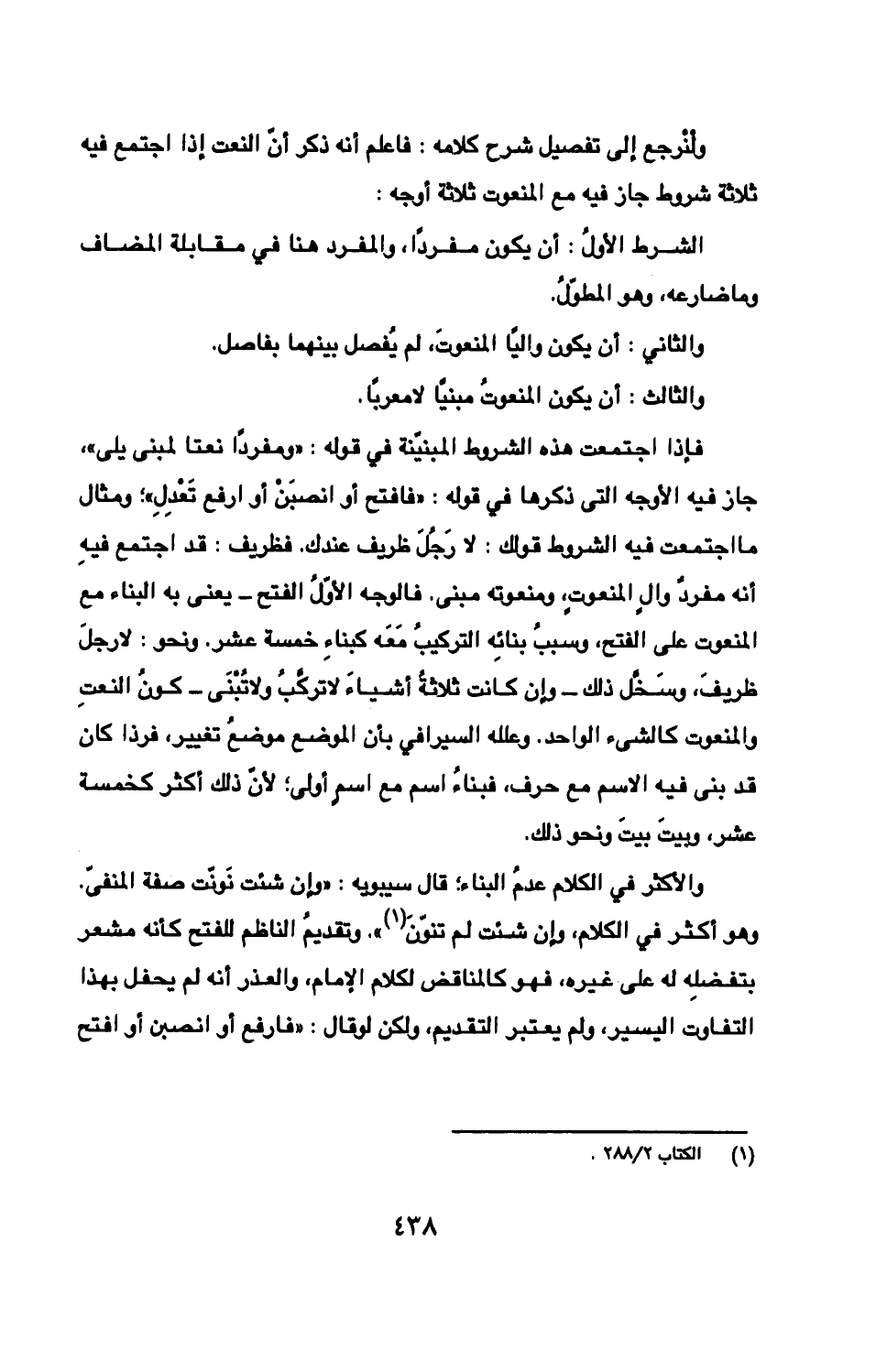 ولنرجع إلى تفصيل شرح كلامه: فاعلم أنه ذكر أنّ النعت إذا اجتمع فيه ثلاثة شروط جاز فيه مع المنعوت ثلاثة أوجه: