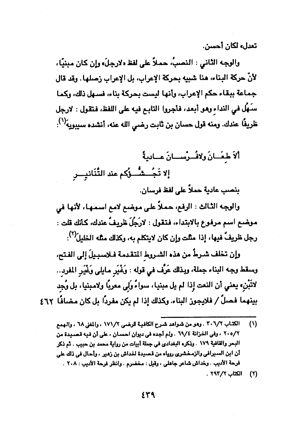 والوجه الثاني: النصبُ، حملًا على لفظ «لا رجلَ» وإن كان مبنيّا، لأنّ حركة البناء، هنا شبيه بحركة الإعراب، بل الإعراب زصلها. وقد قال جماعة ببقاء حكم الإعراب، وأنها ليست بحركة بناء، فسهل ذلك، وكما سَهُل في النداءِ وهو أبعد، فأجروا التابع فيه على اللفظ، فتقول: لا رجل ظريفًا عندك. ومنه قول حسان بن ثابت رضي الله عنه، أنشده سيبويه: