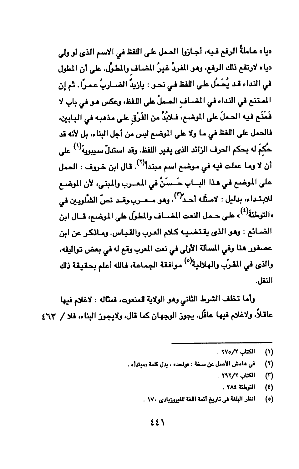 «يا» عاملةٌ الرفع فيه، أجازوا الحمل على اللفظ في الاسم الذى لو ولى «يا» لارتفع ذلك الرفع، وهو المفردُ غيرُ المضافِ والمطوّل. على أن المطول في النداء قد يُحمَلُ على اللفظ في نحو: يا زيدٌ الضاربُ عمرًا. ثم إن الممتنع في النداء في المضافِ الحملُ على اللفظ، وعكس هو في باب لا فَمَنَع فيه الحملَ على الموضع، فلا بُدّ من الفَرْقِ على مذهبه في البابين، فالحمل على اللفظ في ما ولا على الموضع ليس من أجل البناء، بل لأنه قد حُكِمَ له بحكم الحرف الزائد الذى يغير اللفظ. وقد استدلّ سيبويهَ على أن لا وما عملت فيه في موضع اسم مبتدأ. قال ابن خروف: الحمل على الموضع في هذا الباب حَسَنٌ في المعرب والمبنى، لأن الموضع للابتداء، بدليل: لا مثله أحدٌ، وهو معرب. وقد نصّ الشّلوبين في «التوطئةَ» على حمل النعت المضاف والمطوّل على الموضع، قال ابن الضائع: وهو الذى يقتضيه كلام العرب والقياس. وما ذكر عن ابن عصفور هنا وفي المسألة الأولى في نعت المعرب وقع له في بعض تواليفه، والذى في المقرّب والهلاليةَ موافقة الجماعة، فالله أعلم بحقيقة ذلك النقل.