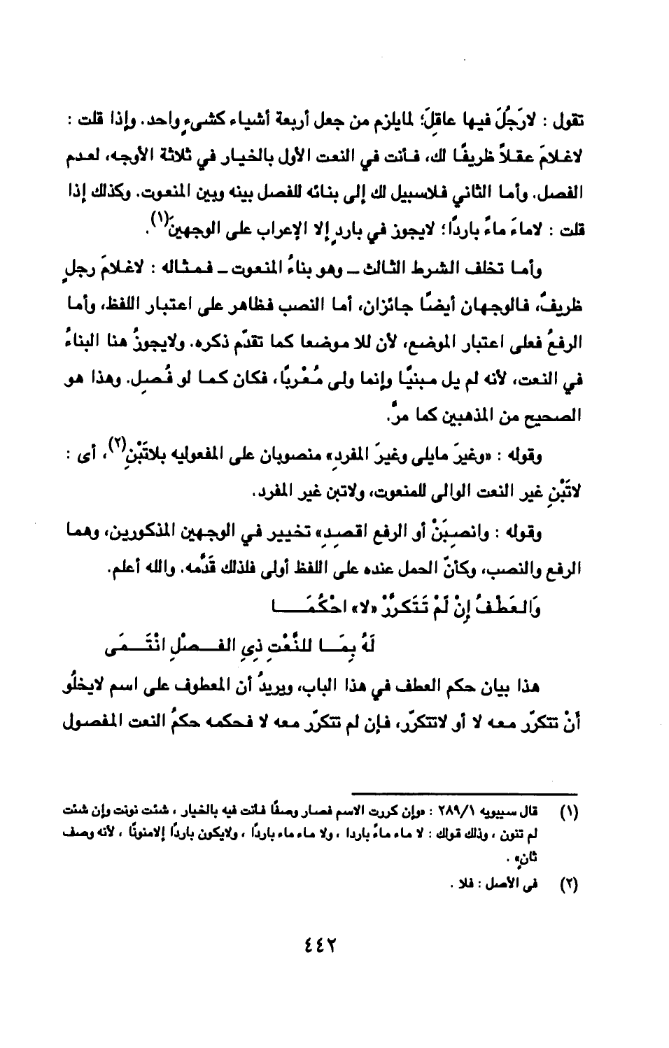 تقول: لا رَجُلَ فيها عاقِلَ؛ لما يلزم من جعل أربعة أشياء كشئٍ واحد. وإذا قلت: لا غلامَ عقلًا ظريفًا لك، فأنت في النعت الأول بالخيار في ثلاثة الأوجه، لعدم الفصل. وأما الثاني فلا سبيل لك إلى بنائه للفصل بينه وبين المنعوت. وكذلك إذا قلت: لا ماءَ ماءً باردًا؛ لا يجوز في باردٍ إلا الإعراب على الوجهينَ.