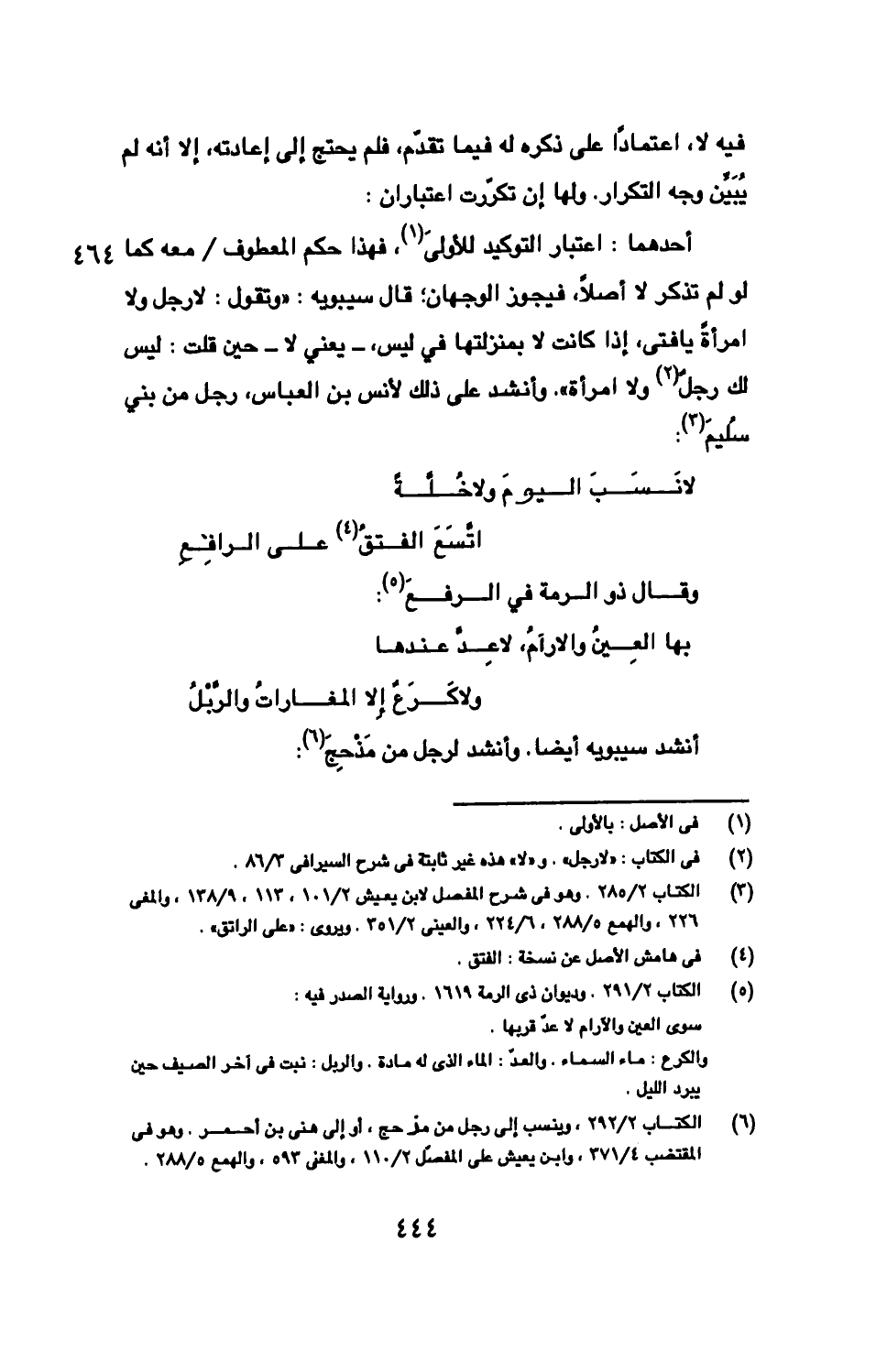 أحدهما: اعتبار التوكيد للأولى، فهذا حكم المعطوف، معه كما لو لم تذكر لا أصلًا، فيجوز الوجهان؛ قال سيبويه: «وتقول: لا رجل ولا امرأةً يا فتى، إذا كانت لا بمنزلتها في ليس، -يعني لا- حين قلت: ليس لك رجلٌ ولا امرأة». وأنشد على ذلك لأنس بن العباس، رجل من بني سُليمَ: