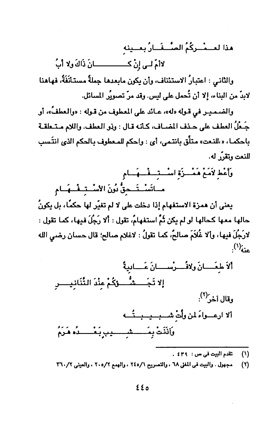 والثاني: اعتبارُ الاستئناف، وأن يكون ما بعدها جملةٌ مستأنَفَةٌ، فها هنا لا بدّ من البناء، إلا أن تُحمل على ليس. وقد مرّ تصويرُ المسائل.