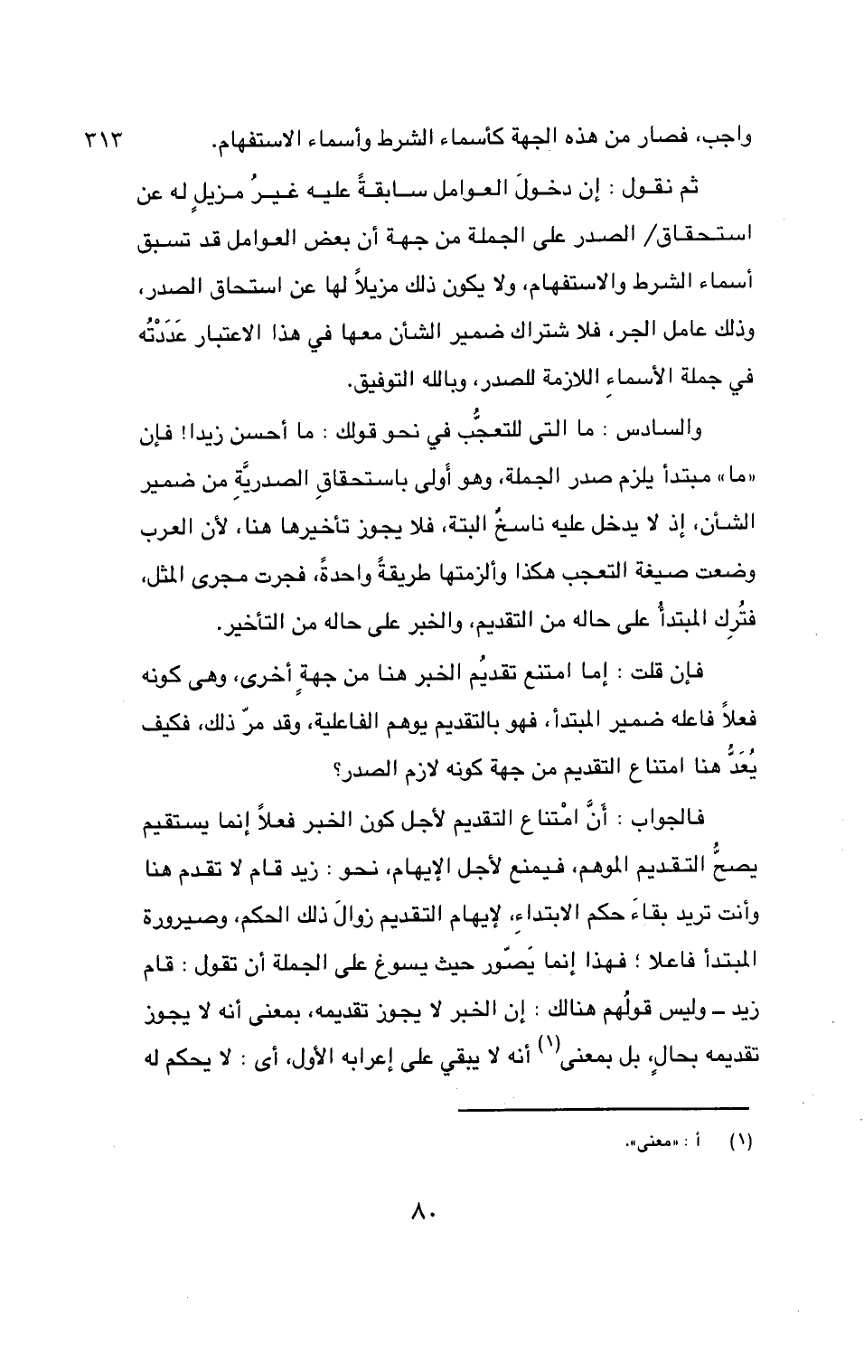 والسادس: ما التى للتعجُّب في نحو قولك: ما أحسن زيدا! فإن «ما» مبتدأ يلزم صدر الجملة، وهو أولى باستحقاقِ الصدريّةِ من ضمير الشأن، إذ لا يدخل عليه ناسخٌ البتة، فلا يجوز تأخيرها هنا، لان العرب وضعت صيغة التعجب هكذا وألزمتها طريقةً واحدةً، فجرت مجرى المثل، فتُرِك المبتدأُ على حاله من التقديم، والخبر على حاله من التأخير.
