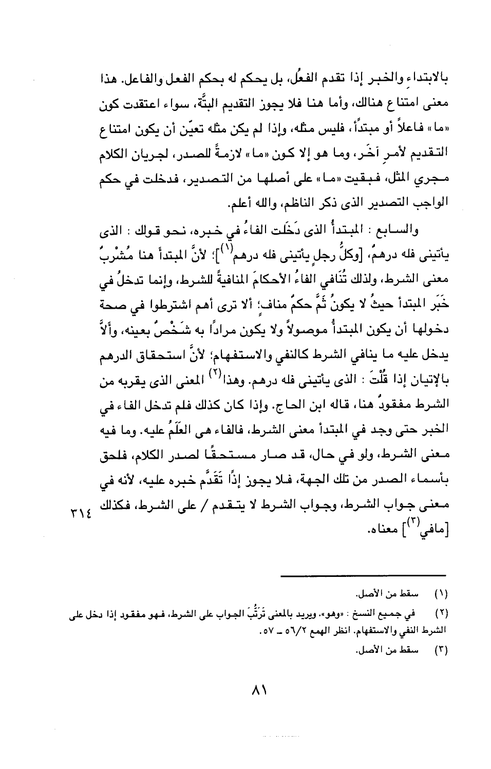 والسابع: المبتدأ الذى دَخَلت الفاءُ في خبره، نحو قولك: الذى يأتيني فله درهمٌ، [وكلُّ رجلٍ يأتينى فله درهم]؛ لأنَّ المبتدأ هنا مُشْربٌ معنى الشرط، ولذلك تُنَافي الفاءُ الأحكامَ المنافيةُ للشرط، وإنما تدخلُ في خَبَر المبتدأ حيثُ لا يكونُ ثَمَّ حكمٌ منافٍ؛ ألا ترى أهم اشترطوا في صحة دخولها أن يكون المبتدأُ موصولًا ولا يكون مرادًا به شَخْصٌ بعينه، وأَلّا يدخل عليه ما ينافي الشرط كالنفي والاستفهام؛ لأنَّ استحقاق الدرهم بالإتيان إذا قُلْتَ: الذى يأتينى فله درهم. وهذا المعنى الذى يقربه من الشرط مفقودٌ هنا، قاله ابن الحاج. وإذا كان كذلك فلم تدخل الفاء في الخبر حتى وجد في المبتدأ معنى الشرط، فالفاء هي العَلَمُ عليه. وما فيه معنى الشرط، ولو في حال، قد صار مستحقًا لصدر الكلام، فلحق بأسماء الصدر من تلك الجهة، فلا يجوز إذًا تَقَدّم خبره عليه، لأنه في معنى جواب الشرط، وجواب الشرط لا يتقدم / على الشرط، فكذلك [ما في] معناه.