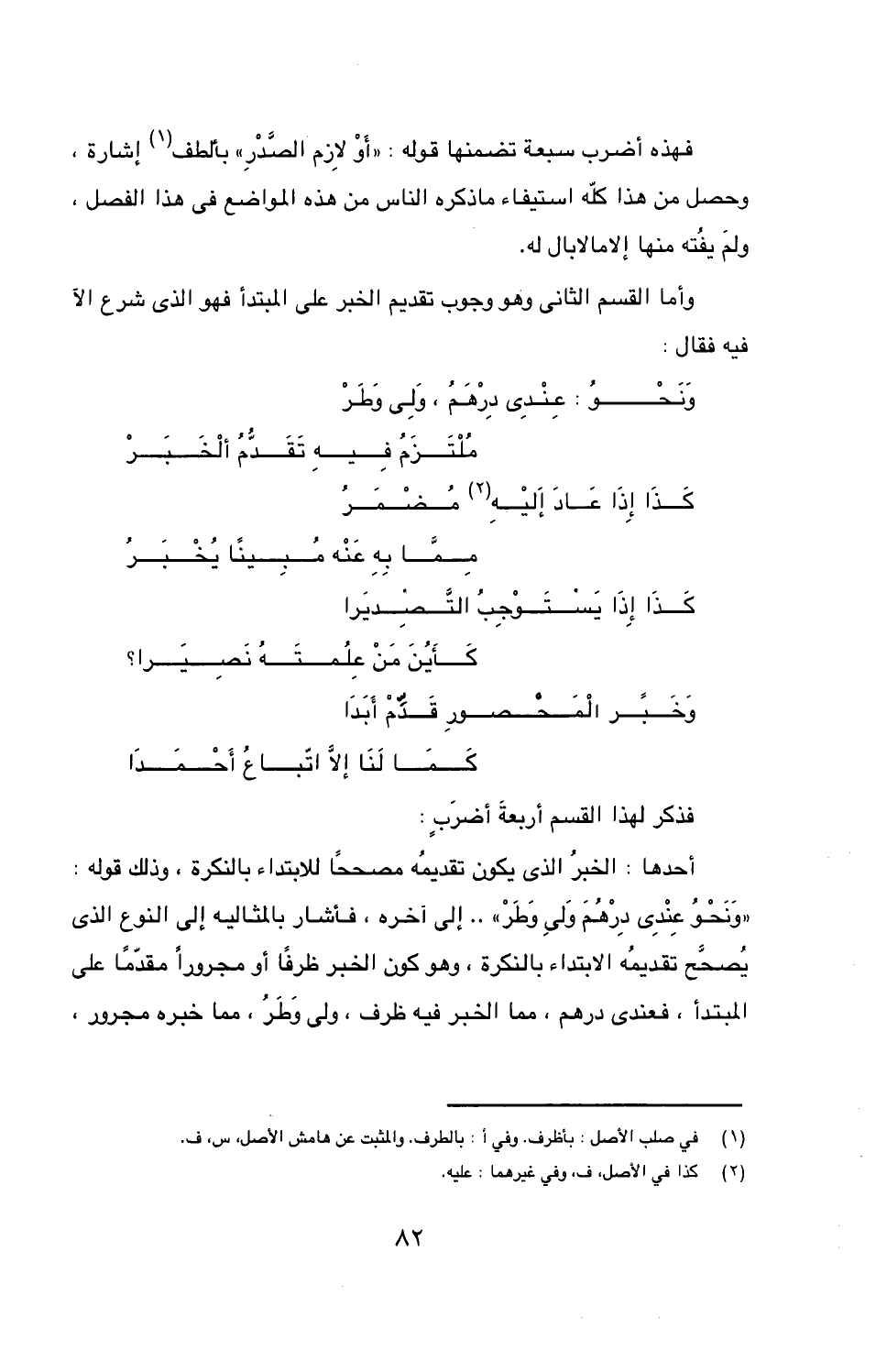 أحدها: الخبرُ الذى يكون تقديمُه مصححًا للابتداء بالنكرة، وذلك قوله: «وَنَحْوُ عِنْدِى دِرْهُمَ وَلىِ وَطَرْ» .. إلى آخره، فأشار بالمثاليه إلى النوع الذى يُصحّح تقديمُه الابتداء بالنكرة، وهو كون الخبر ظرفًا أو مجرورًا مقدّمًا على المبتدأ، فعندى درهم، مما الخبر فيه ظرف، ولى وَطَرُ، مما خبره مجرور