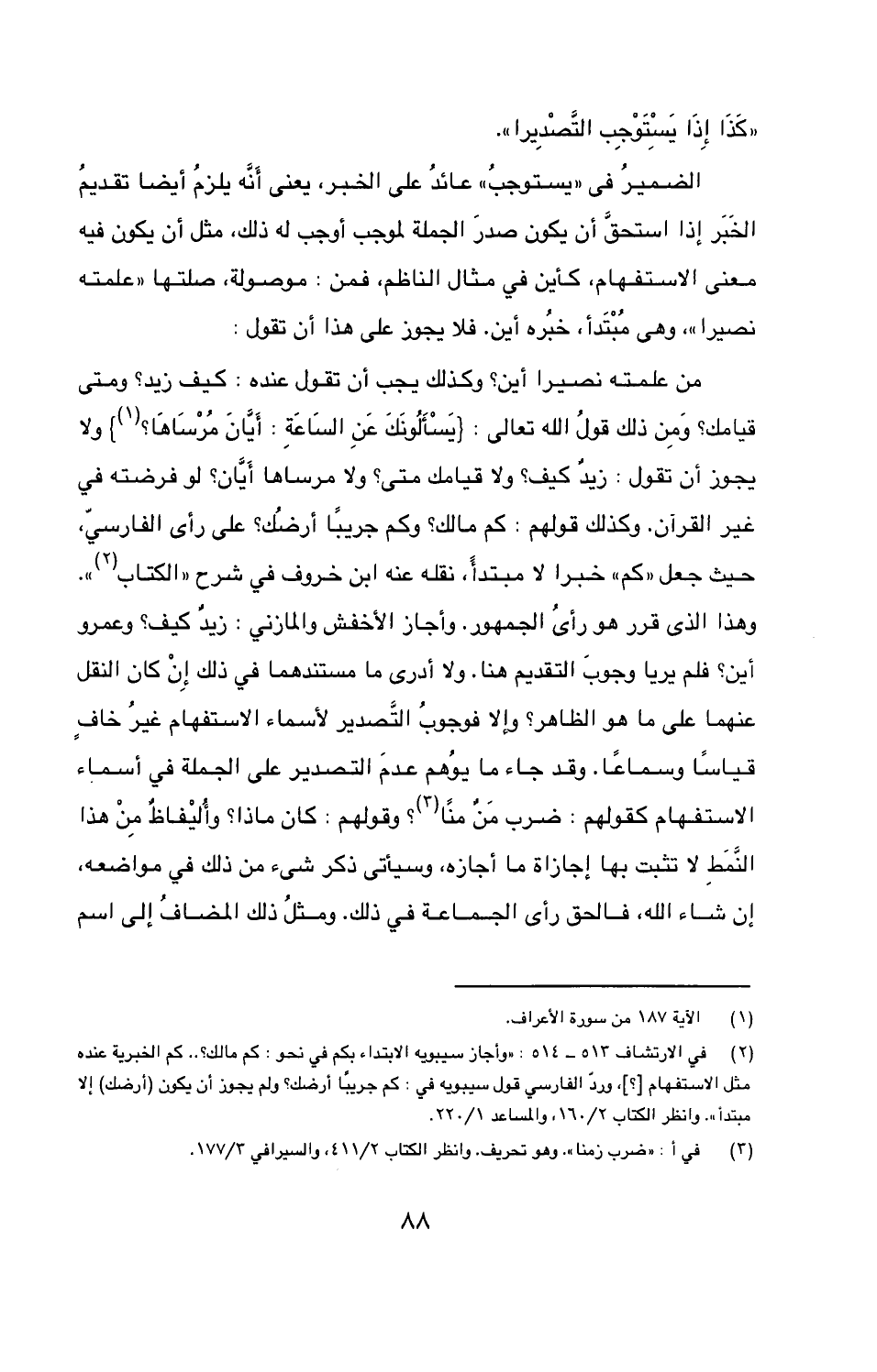 من علمته نصيرا أين؟ وكذلك يجب أن تقول عنده: كيف زيد؟ ومتى قيامك؟ وَمِن ذلك قولُ الله تعالى: {يَسْأَلُونَكَ عَنِ السّاعَةٍ: أيّانَ مُرْسَاهَا؟ } ولا يجوز أن تقول: زيدٌ كيف؟ ولا قيامك متى؟ ولا مرساها أيّان؟ لو فرضته في غير القرآن. وكذلك قولهم: كم مالك؟ وكم جريبًا أرضُك؟ على رأى الفارسيّ، حيث جعل «كم» خبرا لا مبتدأ، نقله عنه ابن خروف في شرح «الكتاب». وهذا الذى قرر هو رأىُ الجمهور. وأجاز الأخفش والمازني: زيدٌ كيف؟ وعمرو أين؟ فلم يريا وجوبَ التقديم هنا. ولا أدرى ما مستندهما في ذلك إِنْ كان النقل عنهما على ما هو الظاهر؟ وإلا فوجوبُ التّصدير على الجملة في أسماء الاستفهام كقولهم: ضرب مَنٌ منّا؟ وقولهم: كان ماذا؟ وأُليْفاظٌ مِنْ هذا النّمَطِ لا تثبت بها إجازاة ما أجازه، وسيأتى ذكر شئ من ذلك في مواضعه، إن شاء الله، فالحق رأى الجماعة في ذلك. ومثلُ ذلك المضافُ إلى اسم