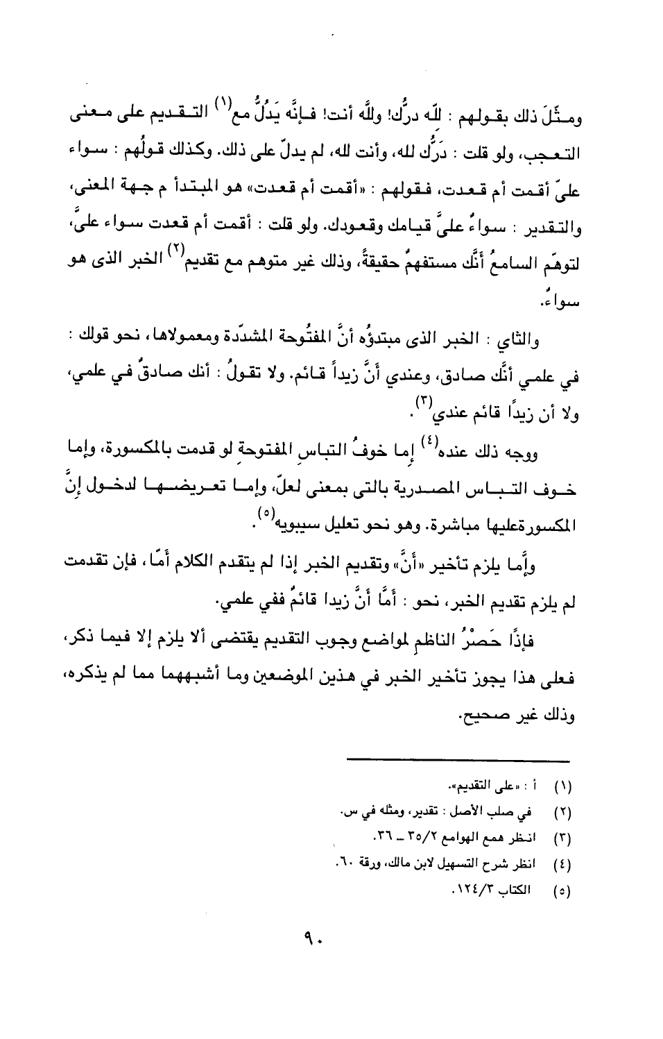 ومثّلَ ذلك بقولهم: لله درُّك! ولله أنت! فإنّه يدُلُّ مع التقديم على معنى التعجب، ولو قلت: دَرُّك لله، وأنت لله، لم يدلّ على ذلك. وكذلك قولُهم: سواء علىّ أقمت أم قعدت، فقولهم: «أقمت أم قعدت» هو المبتدأ م جهة المعنى، والتقدير: سواءٌ علىّ قيامك وقعودك. ولو قلت: أقمت أم قعدت سواء علىَّ، لتوهّم السامعُ أنّك مستفهمٌ حقيقةً، وذلك غير متوهم مع تقديم الخبر الذى هو سواءٌ.