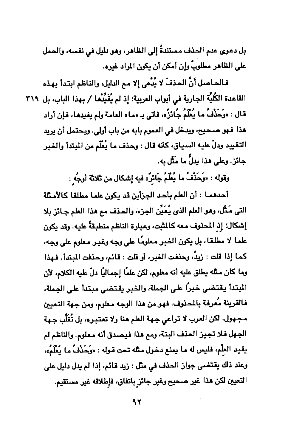 فالحاصل أنّ الحذفَ لا يُدّعى إلا مع الدليل، والناظم ابتدأ بهذه القاعدة الكُلِّية الجارية في أبواب العربية؛ إذ لم يُقَيِّدْها / بهذا الباب، بل قال: «وَحَذْفُ ما يُعْلَمُ جائزٌ»، فأتى بـ «ما» العامة ولم يفيدها، فإن أراد هذا فهو صحيح، ويدخل في العموم بابه من باب أولى. ويحتمل أن يريد التقييم ودلّ عليه السياق، كأنه قال: وحذف ما يُعْلم من المبتدأ والخبر جائز. وعلى هذا يدلُّ ما مَثّل به.