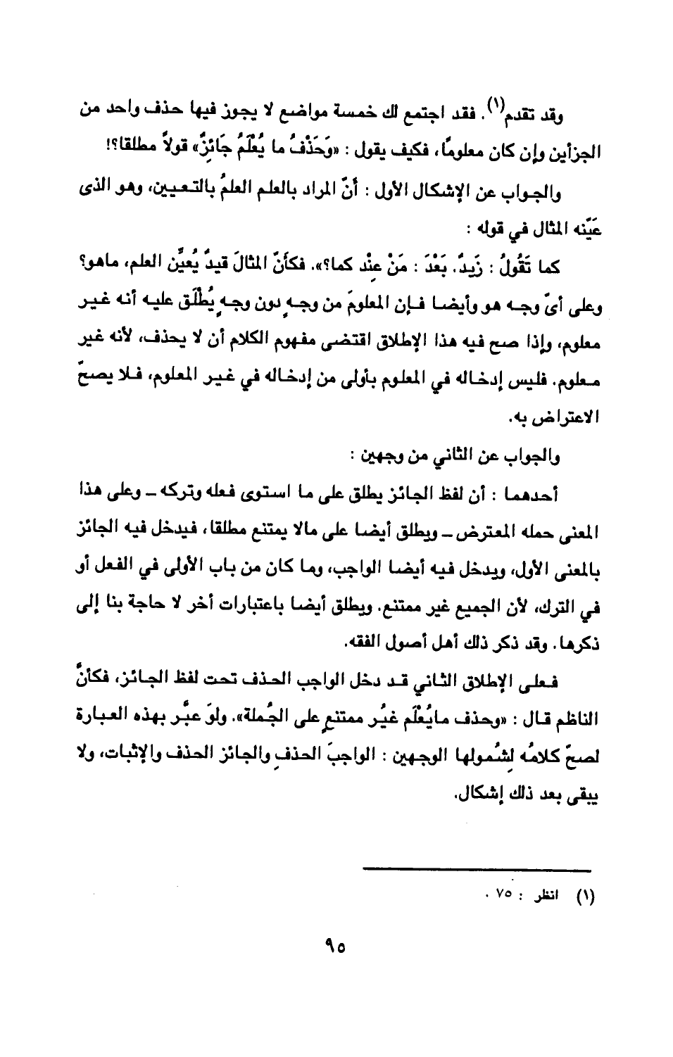 فعلى الإطلاق الثاني قد دخل الواجب الحذف تحت لفظ الجائز، فكأنَّ الناظم قال: «وحذف ما يُعْلَم غيرُ ممتنعٍ على الجُملة». ولَو عبّر بهذه العبارة لصحّ كلامُه لِشُمولها الوجهين: الواجبَ الحذفِ والجائز الحذف والإثبات، ولا يبقى بعد ذلك إشكال.