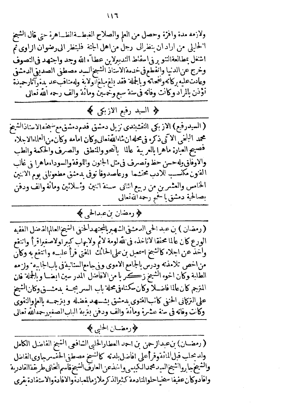 السيد رفيع الأزبكي النقشبندي نزيل دمشق قدم دمشق مع سبخه الاستاذ الشيخ محمد البلخي الآتي ذكره في محله ان شاء الله تعالى وكان امامه وكان من العلماء الأجلاء فصيح العبارة ماهراً بالعربية عالماً بالنحو والمنطق والصرف والحكمة والطب والأوفاق وله حسن حظ وتصرف في مثل الجنون واللوقة والسوداء ماهراً في غالب الفنون مكتسب للأدب محتشماً ورعاً صدوقاً توفي بدمشق مطعوناً في يوم الاثنين الخامس والعشرين من ربيع الثاني سنة اثنين وثلاثين ومائة وألف ودفن بصالحية دمشق بأسفح رحمه الله تعالى.