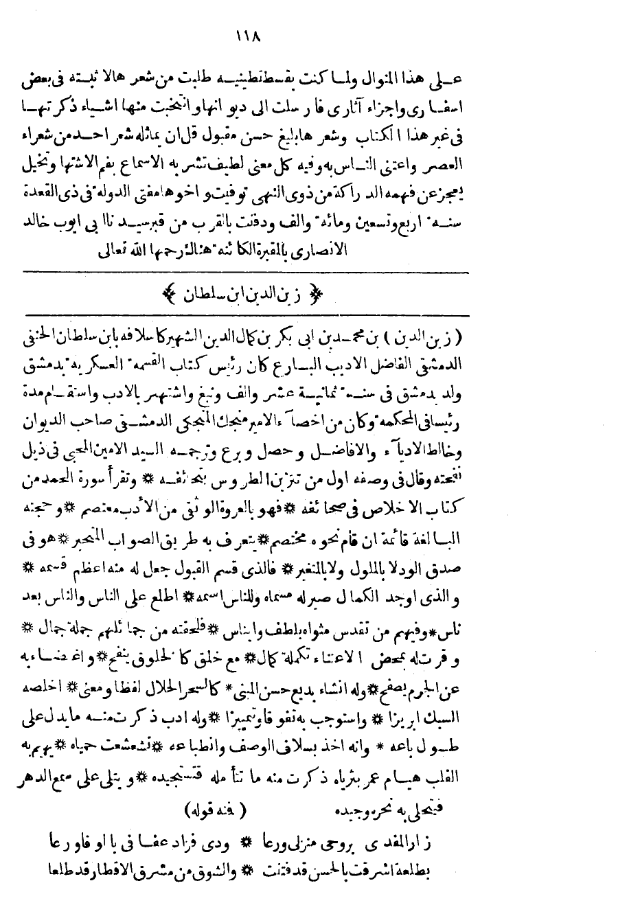 زين الدين بن محمد بن أبي بكر بن كمال الدين الشهير كأسلافه بابن سلطان الحنفي الدمشقي الفاضل الأديب البارع كان رئيس كتاب القسمة العسكرية بدمشق ولد بدمشق في سنة ثمانية عشر وألف ونبغ واشتهر بالأدب واستقام مدة رئيساً في المحكمة وكان من أخصاء الأمير منجك المنجكي الدمشقي صاحب الديوان وخالط الأدباء والأفاضل وحصل وبرع وترجمه السيد الأمين المحبي في ذيل نفحته وقال في وصفه أول من تتزين الطروس بتحائفه وتقرأ سورة الحمد من كتاب الاخلاص في صحائفه فهو بالعروة الوثقى من الأدب معتصم وحجته البالغة قائمة ان قام نحوه مختصم يتعرف به طريق الصواب المتحير هو في صدق الود لا بالملول ولا بالمتغير فالذي قسم القبول جعل له منه أعظم قسمه والذي أوجد الكمال صير له مسماه وللناس اسمه اطلع على الناس والناس بعد ناس وفيهم من تقدس مثواه بلطف وايناس فلحقته من جمائلهم جملة جمال وقرت له بمحض الاعتناء تكملة كمال مع خلق كالخلوق ينفح وأغضابه عن الجرم يصفح وله انشاء بديع حسن المبنى كالسحر الحلال لفظاً ومعنى أخلصه السبك ابريزاً واستوجب به تفوقاً وتمييزاً وله أدب ذكرت منه ما يدل على طول باعه وانه أخذ بسلاف الوصف وانطباعه تشعشعت حمياه يهيم به القلب هيام عمر بثرياه ذكرت منه ما تتأمله قتستجيده ويتلى على سمع الدهر فيتحلى به نحره وجيده.