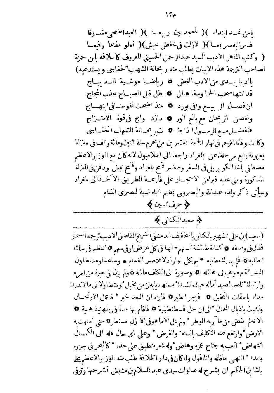 سعيد بن علي الشهير بالكناني بالخفيف الدمشقي الفاضل الأديب ترجمه السمان فقال في وصفه كنانة طائشة السهم لها في كل غرض أو في سهم انتظم في سلك الطلبة فلم يدرك مطلبه بهيكل لو أراد لأهتصر الغمام وساعد لو مد لطاول البدر التمم وهيولي هائلة وصورة إلى التكلف مائلة ولم يزل في حيرة من أمره وارتباك ناصباً الصيد آماله حبال الشباك مستهدياً به لزمن بخيل ومتطاولاً إلى ما لا تدرك مداه باسقات النخيل فزجر الطير فأراه ان البعد خير فاعمل الأرتحال وتشبث بأذيال المحال إلى أن حل قسطنطينية فأقام بها مدة في بلهنية هنية الا أنه لم يقض من مآربه الوطر ولم ينل الا ما هو في الأزل مستطر حتى استوت به الأرض وارتفع عنه التكليف بالسنة والفرض وعلى أي حال فله إلى الكمال انتهاض أتعب به جناح عمره وهاض وله شعر منطبق على حده كالبحر في جزره ومده انتهى ما قاله وأنا أقول ولما كان في دار الخلافة طلب منه الوزير الأعظم علي باشا بن الحكيم أن يشرح له صلوات سيدي عبد السلام بن مشيش فشرحها وتوفي