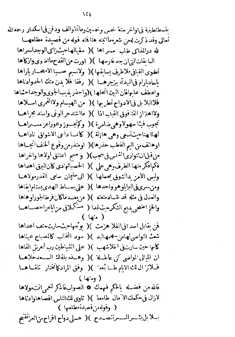بقسطنطينية في أواخر سنة خمس وخمسين ومائة وألف ودفن في اسكدار رحمه الله تعالى وقد ذكرت له من شعره ما أثبته هنا فمنه قوله من قصيدة مطلعها