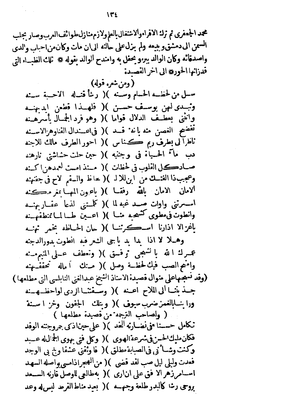 محمد الجعفري ثم ترك الأقراء والاشتغال بالعلم ولازم منازل طوائف العرب وصار يجلب السمن إلى دمشق ويبيعه ولم يزل على حالته إلى أن مات وكان من أحباب والدي وأصدقائه وكان الوالد يبره ويحفل به وامتدح الوالد بقوله تلك الظباء التي قد زانها الحور إلى آخر القصيدة ومن شعره قوله