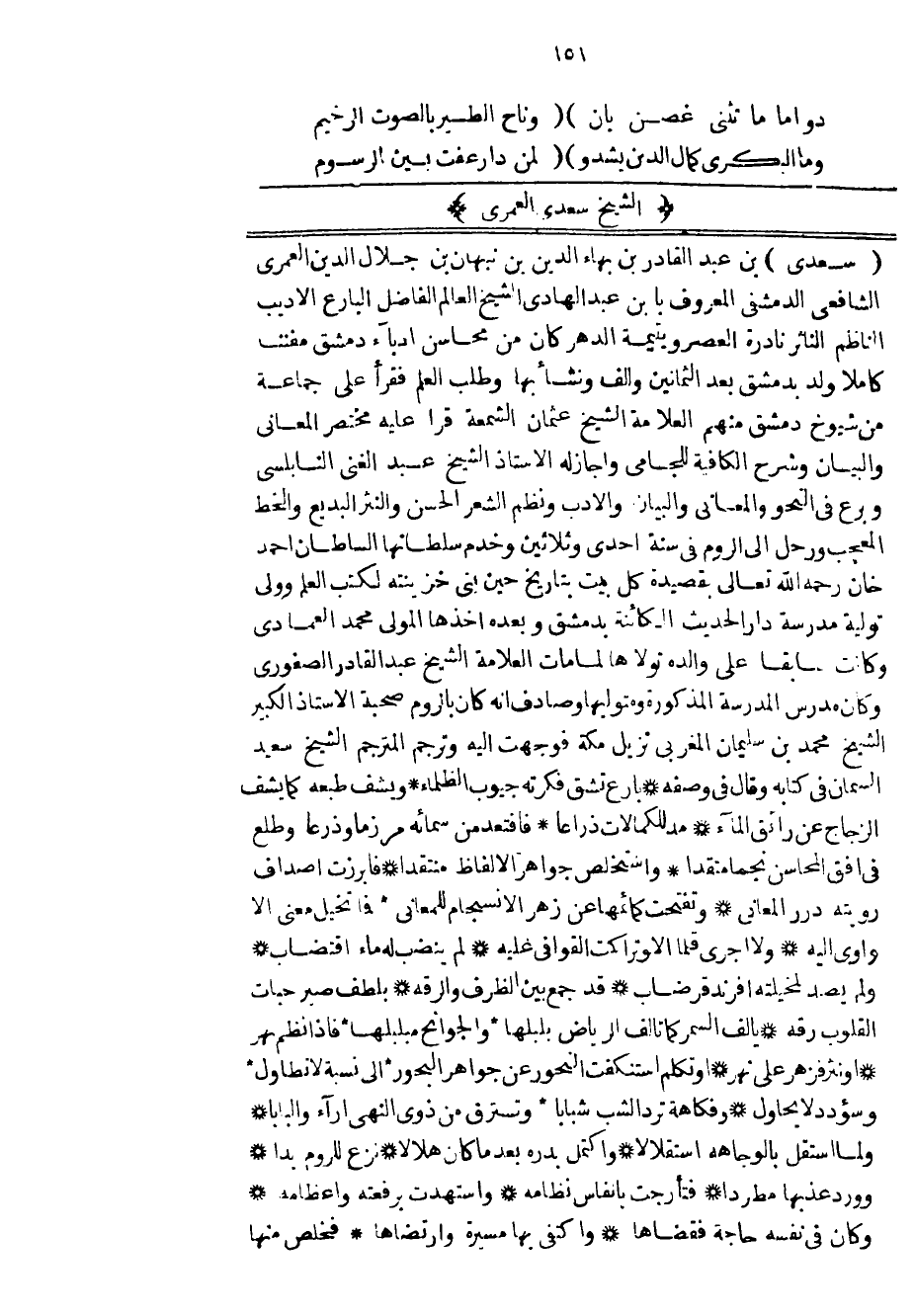 سعدي بن عبد القادر بن بهاء الدين بن نبهان بن جلال الدين العمري الشافعي الدمشقي المعروف بابن عبد الهادي الشيخ العالم الفاضل البارع الأديب الناظم الناثر نادرة العصر ويتيمة الدهر كان من محاسن أدباء دمشق مفنناً كاملاً ولد بدمشق بعد الثمانين وألف ونشأ بها وطلب العلم فقرأ على جماعة من شيوخ دمشق منهم العلامة الشيخ عثمان الشمعة قرأ عليه مختصر المعاني والبيان وشرح الكافية للجامي وأجاز له الاستاذ الشيخ عبد الغني النابلسي وبرع في النحو والمعاني والبيان والأدب ونظم الشعر الحسن والنثر البديع والخط المعجب ورحل إلى الروم في سنة احدى وثلاثين وخدم سلطانها السلطان أحمد خان رحمه الله تعالى بقصيدة كل بيت بتاريخ حين بنى خزينته لكتب العلم وولي تولية مدرسة دار الحديث الكائنة بدمشق وبعده أخذها المولى محمد العمادي وكانت سابقاً على والده تولاها لما مات العلامة الشيخ عبد القادر الصفوري وكان مدرس المدرسة المذكورة ومتوليها وصادف انه كان بالروم صحبة الأستاذ الكبير الشيخ محمد بن سليمان المغربي نزيل مكة فوجهت إليه وترجم المترجم الشيخ سعيد السمان في كتابه وقال في وصفه بارع تشق فكرته جيوب الظلماء ويشف طبعه كما يشف الزجاج عن رائق الماء مد للكمالات ذراعاً فاقتعد من سمائه مرزماً وذرعاً وطلع في أفق المحاسن نجماً متقداً واستخلص جواهر الألفاظ منتقداً فأبرزت أصداف رويته درر المعاني وتفتحت كمائمها عن زهر الأنسجام للمعاني فما تخيل معنى الا وآوى إليه ولا أجرى قلما الا وتراكمت القوافي عليه لم ينضب له ماء اقتضاب ولم يصد لمخيلته افرند قرضاب قد جمع بين الظرف والرقة بلطف صير حبات القلوب رقه يألف السمر كما تألف الرياض بلبلها والجوانح مبلبلها فإذا نظم بهر أو نثر فزهر على نهر أو تكلم استنكفت النحور عن جواهر البحور إلى نسبة لا تطاول وسؤدد لا يحاول وفكاهة ترد الشب شباباً وتسترق من ذوي النهى آراء والبابا ولما استقل بالوجاهة استقلالاً واكتمل بدره بعد ما كان هلالاً نزع للروم بداً وورد عذبها مطرداً فتأرجت بأنفاس نظامه واستهدت برفعته وأعظامه وكان في نفسه حاجة فقضاها واكتفى بها مسيرة وارتضاها فخلص منها