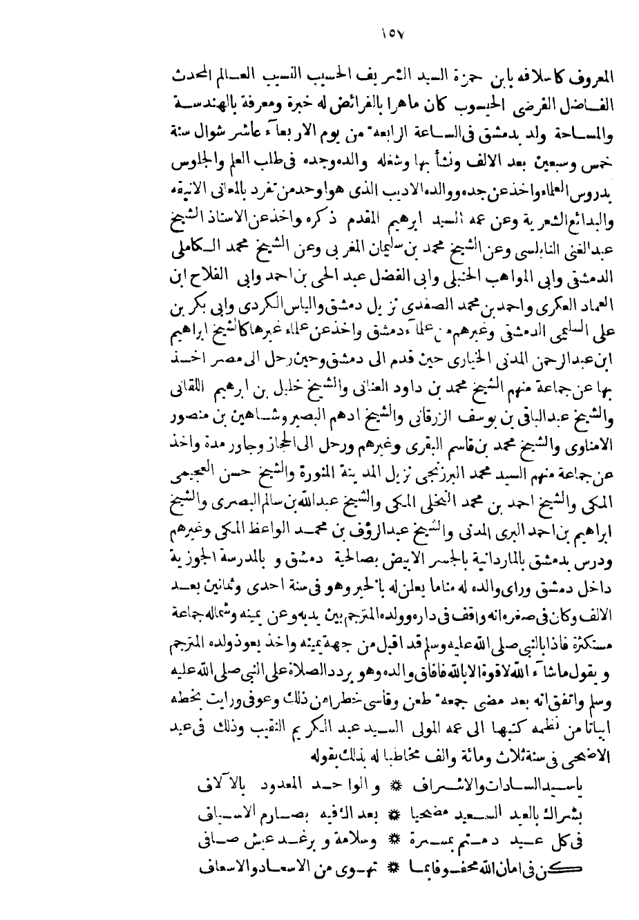 المعروف كأسلافه بابن حمزة السيد الشريف الحسيب النسيب العالم المحدث الفاضل الفرضي الحيسوب كان ماهراً بالفرائض له خبرة ومعرفة بالهندسة والمساحة ولد بدمشق في الساعة الرابعة من يوم الأربعاء عاشر شوال سنة خمس وسبعين بعد الألف ونشأ بها وشغله والده وجده في طلب العلم والجلوس بدروس العلماء وأخذ عن جده ووالده الأديب الذي هو أوحد من تفرد بالمعاني الأنيقة والبدائع الشعرية وعن عمه السيد إبراهيم المقدم ذكره وأخذ عن الاستاذ الشيخ عبد الغني النابلسي وعن الشيخ محمد بن سليمان المغربي وعن الشيخ محمد الكاملي الدمشقي وأبي المواهب الحنبلي وأبي الفضل عبد الحي بن أحمد وأبي الفلاح ابن العماد العكري وأحمد بن محمد الصفدي نزيل دمشق والياس الكردي وأبي بكر بن علي السليمي الدمشقي وغيرهم من علماء دمشق وأخذ عن علماء غيرها كالشيخ إبراهيم ابن عبد الرحمن المدني الخياري حين قدم إلى دمشق وحين رحل إلى مصر أخذ بها عن جماعة منهم الشيخ محمد بن داود العناني والشيخ خليل بن إبراهيم اللقاني والشيخ عبد الباقي بن يوسف الزرقاني والشيخ أدهم البصير وشاهين بن منصور الأمناوي والشيخ محمد بن قاسم البقري وغيرهم ورحل إلى الحجاز وجاور مدة وأخذ عن جماعة منهم السيد محمد البرزنجي نزيل المدينة المنورة والشيخ حسن العجيمي المكي والشيخ أحمد بن محمد النخلي المكي والشيخ عبد الله بن سالم البصري والشيخ إبراهيم بن أحمد البري المدني والشيخ عبد الرؤف بن محمد الواعظ المكي وغيرهم ودرس بدمشق بالماردانية بالجسر الأبيض بصالحية دمشق وبالمدرسة الجوزية داخل دمشق ورأى والده له مناماً يعلن له بالخير وهو في سنة احدى وثمانين بعد الألف وكان في صغره انه واقف في داره وولده المترجم بين يديه وعن يمينه وشماله جماعة مستكثرة فإذا بالنبي صلى الله عليه وسلم قد أقبل من جهة يمينه وأخذ يعوذ ولده المترجم ويقول ما شاء الله لا قوة الا بالله فأفاق والده وهو يردد الصلاة على النبي صلى الله عليه وسلم واتفق انه بعد مضي جمعة طعن وقاسى خطراً من ذلك وعوفي ورأيت بخطه أبياتاً من نظمه كتبها إلى عمه المولى السيد عبد الكريم النقيب وذلك في عيد الأضحى في سنة ثلاث ومائة وألف مخاطباً له بذلك بقوله