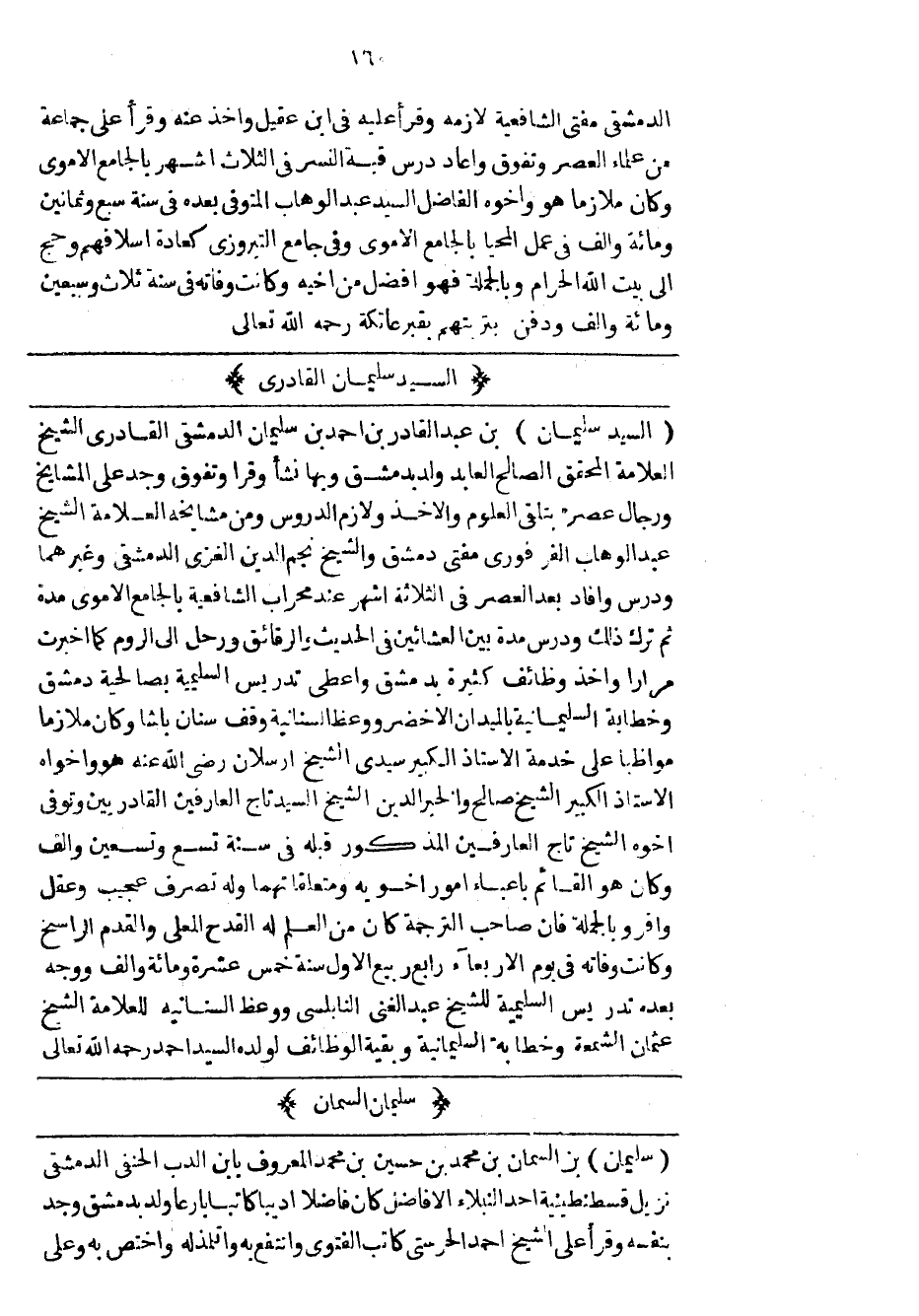 السيد سليمان بن عبد القادر بن أحمد بن سليمان الدمشقي القادري الشيخ العلامة المحقق الصالح العابد ولد بدمشق وبها نشأ وقرأ وتفوق وجد على المشايخ ورجال عصره بتلقي العلوم والأخذ ولازم الدروس ومن مشايخه العلامة الشيخ عبد الوهاب الفرفوري مفتي دمشق والشيخ نجم الدين الغزي الدمشقي وغيرهما ودرس وأفاد بعد العصر في الثلاثة أشهر عند محراب الشافعية بالجامع الأموي مدة ثم ترك ذلك ودرس مدة بين العشائين في الحديث والرقائق ورحل إلى الروم كما أخبرت مراراً وأخذ وظائف كثيرة بدمشق وأعطى تدريس السليمية بصالحية دمشق وخطابة السليمانية بالميدان الأخضر ووعظ السنانية وقف سنان باشا وكان ملازماً مواظباً على خدمة الاستاذ الكبير سيدي الشيخ أرسلان رضي الله عنه هو وأخواه الاستاذ الكبير الشيخ صالح والخير الدين الشيخ السيد تاج العارفين القادريين وتوفي أخوه الشيخ تاج العارفين المذكور قبله في سنة تسع وتسعين وألف وكان هو القائم بأعباء أمور أخويه ومتعلقاتهما وله تصرف عجيب وعقل وافر وبالجملة فان صاحب الترجمة كان من العلم له القدح المعلى والقدم الرأسخ وكانت وفاته في يوم الأربعاء رابع ربيع الأول سنة خمس عشرة ومائة وألف ووجه بعده تدريس السليمية للشيخ عبد الغني النابلسي ووعظ السنانية للعلامة الشيخ عثمان الشمعة وخطابة السليمانية وبقية الوظائف لولده السيد أحمد رحمه الله تعالى.