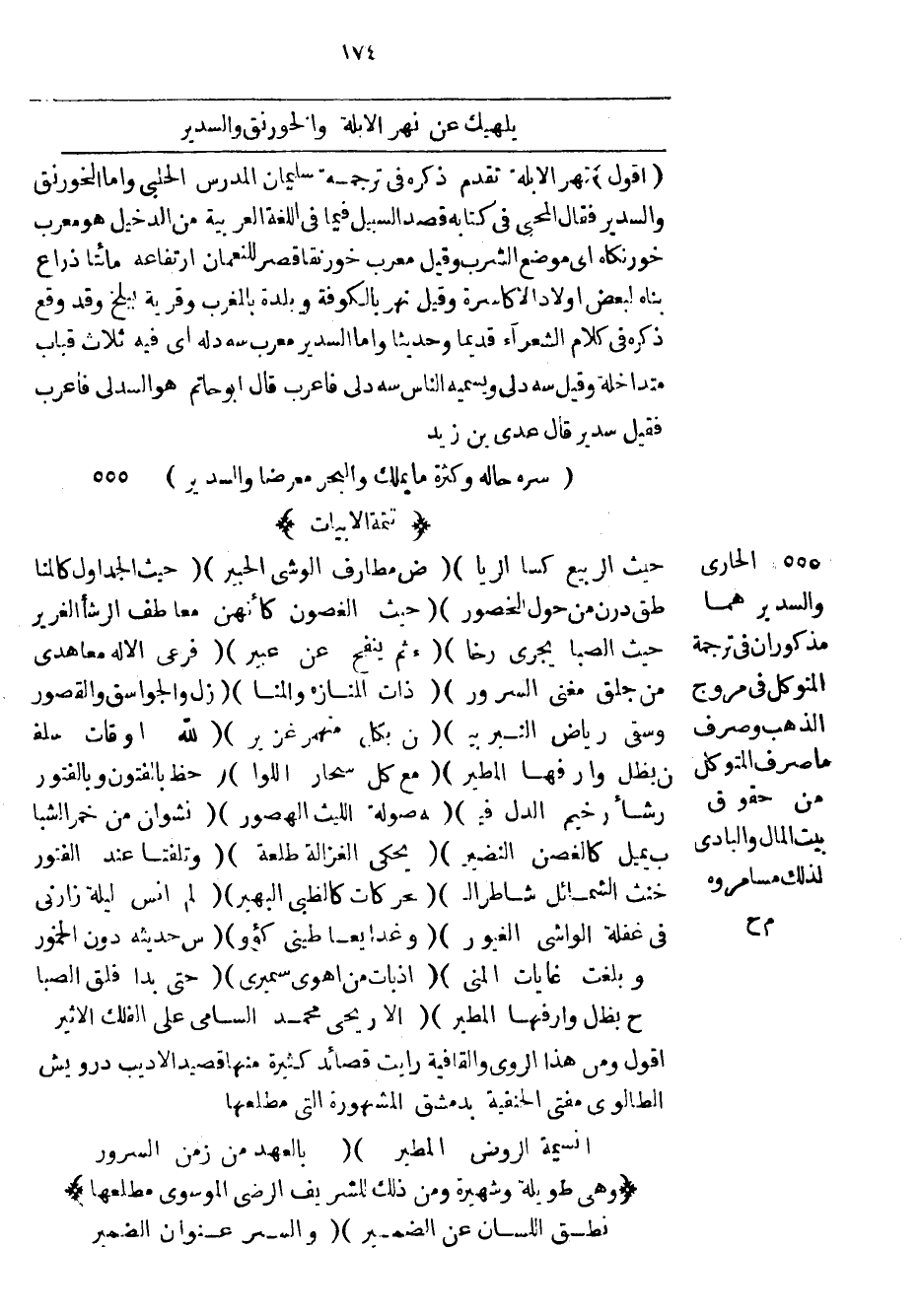 أقول نهر الأبلة تقدم ذكره في ترجمة سليمان المدرس الحلبي وأما الخورنق والسدير فقال المحبي في كتابه قصد السبيل فيما في اللغة العربية من الدخيل هو معرب خورنكاه أي موضع الشرب وقيل معرب خورنقاً قصر للنعمان ارتفاعه مائتا ذراع بناه لبعض أولاد الأكاسرة وقيل نهر بالكوفة وبلدة بالمغرب وقرية ببلخ وقد وقع ذكره في كلام الشعراء قديماً وحديثاً وأما السدير معرب سه دله أي فيه ثلاث قباب متداخلة وقيل سه دلى ويسميه الناس سه دلى فأعرب قال أبو حاتم هو السدلى فأعرب فقيل سدير قال عدي بن زيد