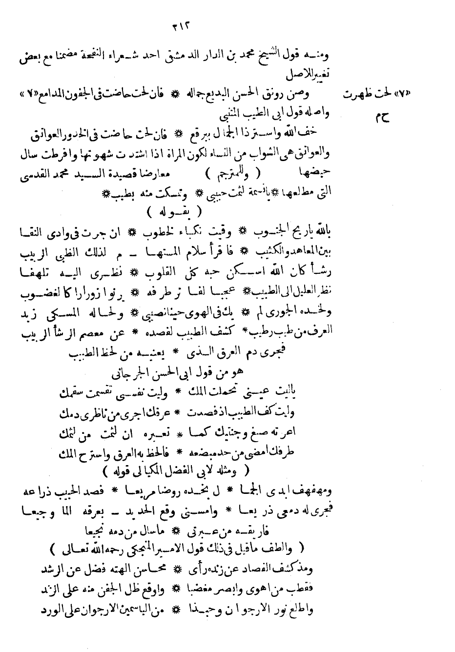والعواتق هي الشواب من النساء لكون المرأة إذا اشتدت شهوتها وأفرطت سال حيضها وللمترجم معارضاً قصيدة السيد محمد القدسي التي مطلعها