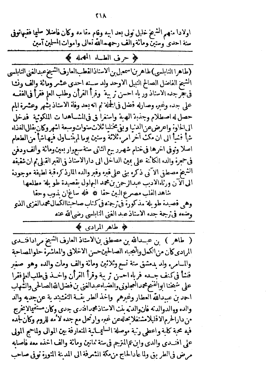طاهر النابلسي طاهر بن إسماعيل بن الأستاذ القطب العارف الشيخ عبد الغني النابلسي الشيخ الفاضل الصالح النبيل الأوحد ولد سنة احدى عشر ومائة وألف ونشأ في حجر جده الأستاذ ورباه أحسن تربية وقرأ القرأن وطلب العلم فقرأ في الفقه على جده وغيره وصار له فضل في الجملة ثم إنه بعد وفاة الأستاذ بشهر وعشرة أيام حصل له اصطلام وجذبة الهية واستغراق في المشاهدات الملكوتية فدخل إلى الخلوة وأعرض عن الدنيا وبقي مختلياً ثلاث سنوات وسبعة أشهر وكان يقلل الغذاء شيأً فشيأً إلى أن مكث آخر أمره ثلاثة وستين يوماً لم يتناول فيها شيئاً من الطعام أصلاً وتوفي أخرها في ختام شهر ربيع الثاني سنة سبع وأربعين ومائة وألف ودفن في حجرة والده الكائنة على يمين الداخل إلى دار الاستاذ في القبر القبلي ثم إن شقيقه الشيخ مصطفى الآتي ذكره بني على قبره وقبر والده المار ذكره قبة لطيفة موجودة إلى الآن ورثاه الأديب عبد الرحمن بن محمد البهلول بقصيدة طويلة مطلعها