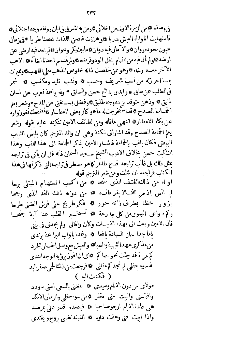 في وصفه من الزمرة الأولى من أخلائي ومن به أشرق في أبان رونقه وجه اجتلائي فاستهليت أنا وإياه العيش بدرياً وهززت غصن اللذات غصناً طرياً في زمان عيون سعوده روان والآمال فيه دوان ما بين بكر وعوان لم يتعد فيه أرضي عن أرضه ولم نأل فيه من القيام بنفل الود وفرضه ولم يتنسم أحدنا أخاء الأهب الآخر معه رخاء وهو ممن خلصت ذاته خلوص الذهب على اللهب وتميزت بما أحرزته من نسب شريف وحسب ونشب تليد ومكتسب شمر في الطلب عن ساق وأبدى بدائع حسن واتساق وله براعة تعرب عن لسان ذليق وذهن متوقد يزينه وجه طليق وفضل يستغني عن المدح وشعر يعلم الحمامة الصدح قد استخرجت له ما هو كالروض المعطار تضحك ثغور نواره عن بكاء الأمطار انتهى ما قاله ومن لطائف الأمين تنكيته عليه بقوله وشعر يعلم الحمامة الصدح وقد أشار إلى نكتة وهي أن والد المترجم كان يلبس الثياب البيض فكان يلقب بالحمامة فأشار الأمين بذكر الحمامة إلى هذا اللقب وهذا التنكيت حسن بخلاف الأديب الشيخ سعيد السمان فإنه قل إن يأتي في تراجمه بمثل ذلك بل غالب تراجمه قدح ظاهر كما هو مسطر في تراجمه التي ذكرتها في هذا الكتاب فراجعه إن شئت ومن شعر المترجم قوله