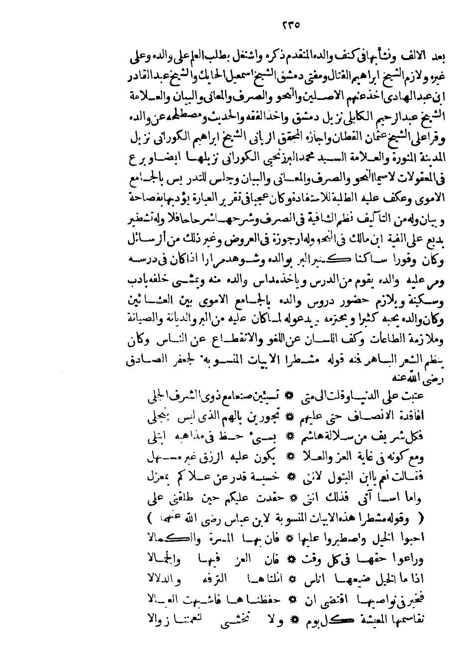 بعد الألف ونشأ بها في كنف والده المتقدم ذكره واشتغل بطلب العلم على والده وعلى غيره ولازم الشيخ إبراهيم الفتال ومفتي دمشق الشيخ إسماعيل الحايك والشيخ عبد القادر ابن عبد الهادي أخذ عنهم الأصلين والنحو والصرف والمعاني والبيان والعلامة الشيخ عبد الرحيم الكابلي نزيل دمشق وأخذ الفقه والحديث ومصطلحه عن والده وقرأ على الشيخ عثمان القطان وأجازه المحقق الرباني الشيخ إبراهيم الكوراني نزيل المدينة المنورة والعلامة السيد محمد البرزنجي الكوراني نزيلها أيضاً وبرع في المعقولات لا سيما النحو والصرف والمعاني والبيان وجلس للتدريس بالجامع الأموي وعكف عليه الطلبة للاستفادة وكان عجباً في تقرير العبارة يؤديها بفصاحة وبيان وله من التآليف نظم الشافية في الصرف وشرحها شرحاً حافاً وله تشطير بديع على ألفية ابن مالك في النحو وله أرجوزة في العروض وغير ذلك من الرسائل وكان وقوراً ساكناً كثير البر بوالده وشوهد مراراً إذا كان في درسه ومر عليه والده يقوم من الدرس ويأخذ مداس والده منه ويمشي خلفه بأدب وسكينة ويلازم حضور دروس والده بالجامع الأموي بين العشائين وكان والده يحبه كثيراً ويحترمه ويدعو له لما كان عليه من البر والديانة والصيانة وملازمة الطاعات وكف اللسان عن اللغو والانقطاع عن الناس وكان ينظم الشعر الباهر فمنه قوله مشطراً الأبيات المنسوبة لجعفر الصادق رضي الله عنه