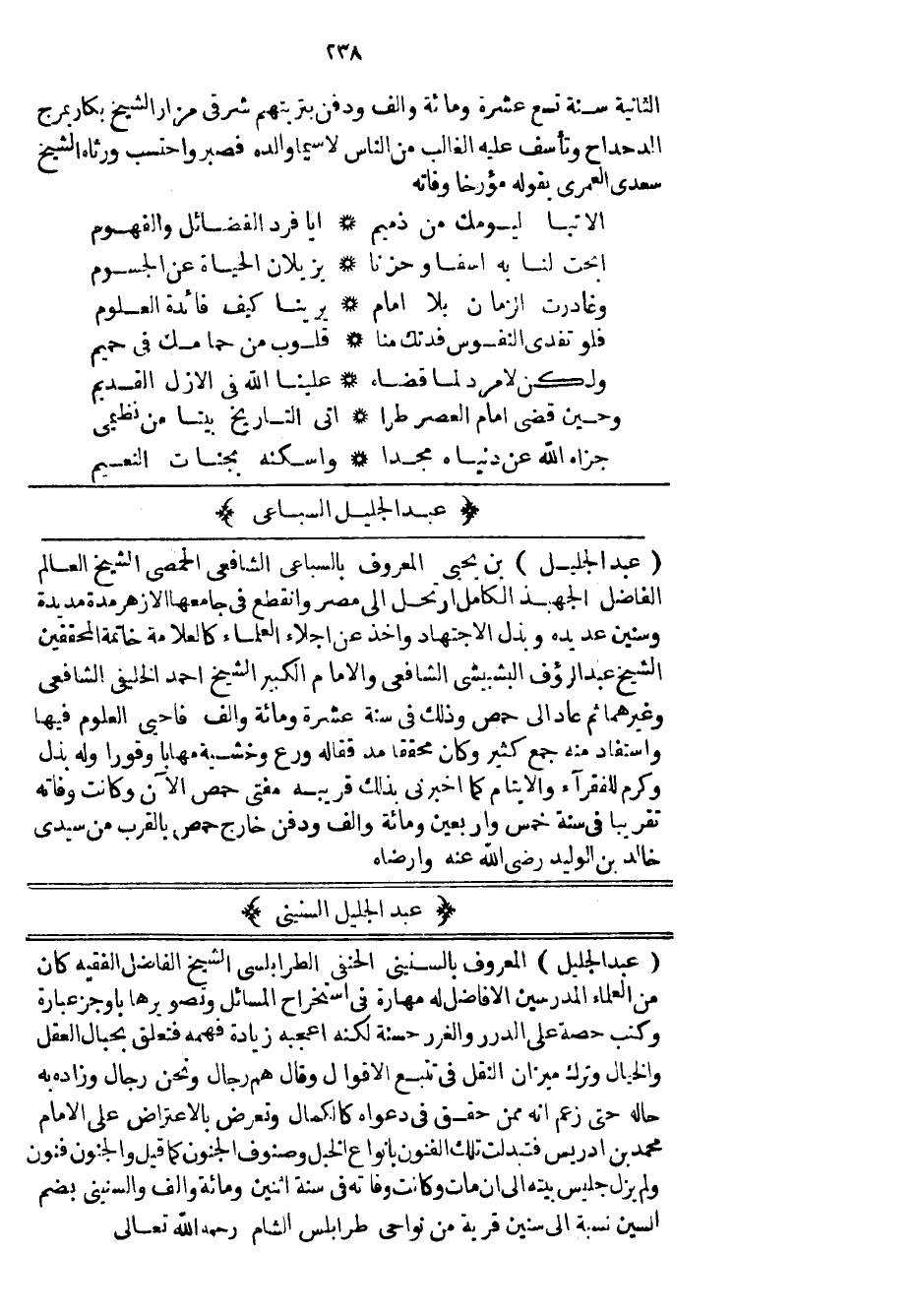 عبد الجليل بن يحيى المعروف بالسباعي الشافعي الحمصي الشيخ العالم الفاضل الجهبذ الكامل ارتحل إلى مصر وانقطع في جامعها الأزهر مدة مديدة وسنين عديدة وبذل الاجتهاد وأخذ عن اجلاء العلماء كالعلامة خاتمة المحققين الشيخ عبد الرؤف البشبيشي الشافعي والامام الكبير الشيخ أحمد الخليفي الشافعي وغيرهما ثم عاد إلى حمص وذلك في سنة عشرة ومائة وألف فأحيى العلوم فيها واستفاد منه جمع كثير وكان محققاً مدققاً له ورع وخشية مهاباً وقوراً وله بذل وكرم للفقراء والأيات كما أخبرني بذلك قريبه مفتي حمص الآن وكانت وفاته تقريباً في سنة خمس وأربعين ومائة وألف ودفن خارج حمص بالقرب من سيدي خالد بن الوليد رضي الله عنه وأرضاه.