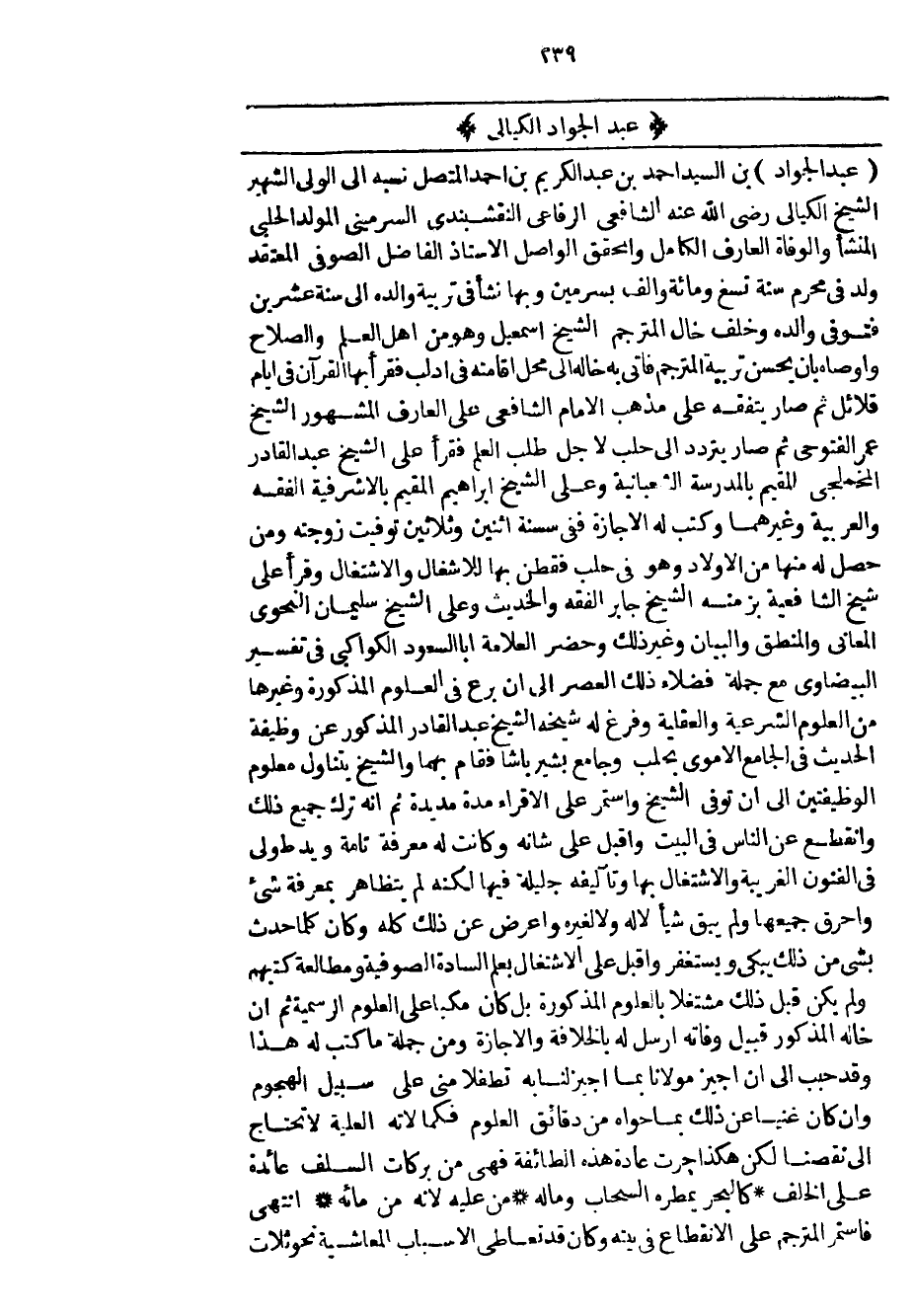 عبد الجواد بن السيد أحمد بن عبد الكريم بن أحمد المتصل نسبه إلى الولي الشهير الشيخ الكيالي رضي الله عنه الشافعي الرفاعي النقشبندي السرميني المولد الحلبي المنشأ والوفاة العارف الكامل والمحقق الواصل الاستاذ الفاضل الصوفي المعتقد ولد في محرم سنة تسع ومائة وألف بسرمين وبها نشأ في تربية والده إلى سنة عشرين فتوفي والده وخلف خال المترجم الشيخ إسماعيل وهو من أهل العلم والصلاح وأوصاه بأن يحسن تربية المترجم فأتى به خاله إلى محل إقامته في ادلب فقرأ بها القرآن في أيام قلائل ثم صار يتفقه على مذهب الامام الشافعي علي العارف المشهور الشيخ عمر الفتوحي ثم صار يتردد إلى حلب لأجل طلب العلم فقرأ على الشيخ عبد القادر المخملجي المقيم بالمدرسة الثعبانية وعلى الشيخ إبراهيم المقيم بالأشرفية الفقه والعربية وغيرهما وكتب له الاجازة ففي سنة اثنين وثلاثين توفيت زوجته ومن حصل له منها من الأولاد وهو في حلب فقطن بها للأشغال والاشتغال وقرأ على شيخ الشافعية بزمنه الشيخ جابر الفقه والحديث وعلى الشيخ سليمان النحوي المعاني والمنطق والبيان وغير ذلك وحضر العلامة أبا السعود الكواكبي في تفسير البيضاوي مع جملة فضلاء ذلك العصر إلى أن برع في العلوم المذكورة وغيرها من العلوم الشرعية والعقلية وفرغ له شيخه الشيخ عبد القادر المذكور عن وظيفة الحديث في الجامع الأموي بحلب وجامع بشير باشا فقام بهما والشيخ يتناول معلوم الوظيفتين إلى أن توفي الشيخ واستمر على الاقراء مدة مديدة ثم إنه ترك جميع ذلك وانقطع عن الناس في البيت وأقبل على شأنه وكانت له معرفة تامة ويد طولى في الفنون الغريبة والاشتغال بها وتآليفه جليلة فيها لكنه لم يتظاهر بمعرفة شيء وأحرق جميعها ولم يبق شيأً لأله ولا لغيره وأعرض عن ذلك كله وكان كلما حدث بشيء من ذلك يبكي ويستغفر وأقبل على الاشتغال بعلم السادة الصوفية ومطالعة كتبهم ولم يكن قبل ذلك مشتغلاً بالعلوم المذكورة بل كان مكباً على العلوم الرسمية ثم إن خاله المذكور قبيل وفاته أرسل له بالخلافة والاجازة ومن جملة ما كتب له هذا وقد حبب إلى أن أجيز مولانا بما أجيز لنا به تطفلاً مني على سبيل الهجوم وإن كان غنياً عن ذلك بما حواه من دقائق العلوم فكمالاته العلية لا تحتاج إلى نقصنا لكن هكذا جرت عادة هذه الطائفة فهي من بركات السلف عائدة على الخلف كالبحر يمطره السحاب وماله من عليه لأنه من مائه انتهى فاستمر المترجم على الانقطاع في بيته وكان قد تعاطى الأسباب المعاشية نحو ثلاث