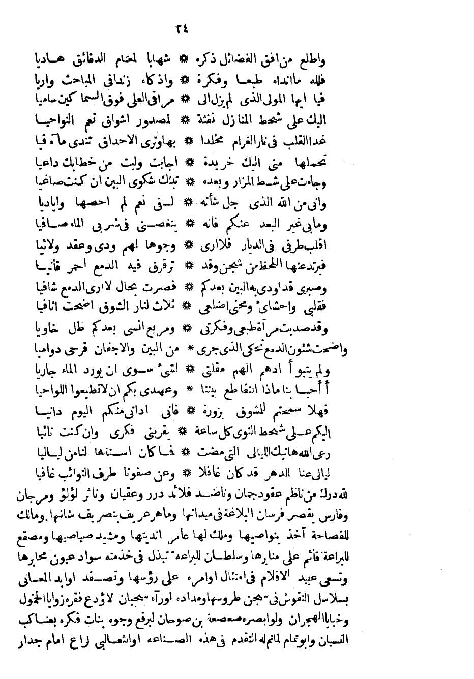 لله درك من ناظم عقود جمان وناضد قلائد درر وعقيان وناثر لؤلؤ ومرجان وفارس يقصر فرسان البلاغة في ميدانها وماهر عريف بتصريف شأنها. ومالك للفصاحة آخذ بنواصيها وملك لها عامر أنديتها ومشيد صياصيها ومصقع للبراعة قائم على منابرها وسلطان للبراعة تبذل في خدمته سواد عيون محابرها وتسعى عبيد الأقلام في امتثال أوامره على رؤسها وتصفد أوابد المعاني بسلاسل النقوش في سجن طروسها ومداده لو رآه سجان لأودع فقره زوايا الخمول وخبايا الهجران ولو أبصره صعصعة بن صوحان لبرقع وجوه بنات فكره بعناكب النسيان وأبو تمام لما تم له التقدم في هذه الصناعة أو الثعالبي لراع أمام جدار