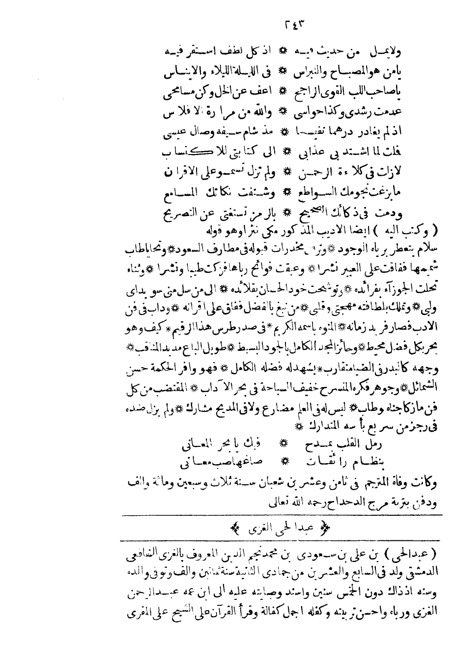 عبد الحي بن علي بن سعودي بن محمد نجم الدين المعروف بالغزي الشافعي الدمشقي ولد في السابع والعشرين من جمادي الثانية سنة ثمانين وألف وتوفي والده وسنه إذ ذاك دون الخمس سنين وأسند وصايته عليه إلى ابن عمه عبد الحرمن الغزي ورباه وأحسن تربيته وكفله أجمل كفالة وقرأ القرآن على الشيخ علي المقري