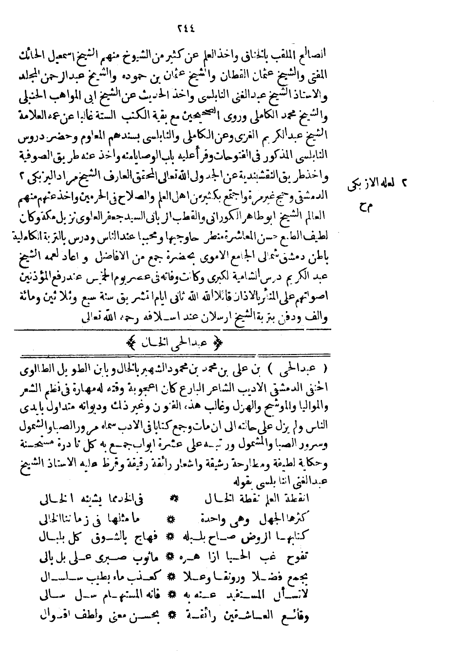 عبد الحي بن علي بن محمد بن محمود الشهير بالخال وبابن الطويل الطالوي الحنفي الدمشقي الأديب الشاعر البارع كان اعجوبة وقته له مهارة في نظم الشعر والمواليا والموشح والهزل وغالب هذه الفنون وغير ذلك وديوانه متداول بأيدي الناس ولم يزل على حالته إلى أن مات وجمع كتاباً في الأدب سماه مرور الصبا والشمول وسرور الصبا والمشمول ورتبه على عشرة أبواب جمع به كل نادرة مستحسنة وحكاية لطيفة ومطارحة رشيقة وأشعار رائقة رقيقة وقرظ عليه الاستاذ الشيخ عبد الغني النابلسي بقوله