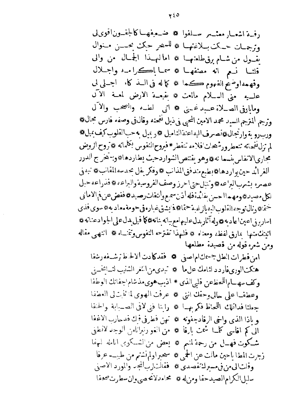وترجم المترجم السيد محمد الأمين المحبي في ذيل نفحته وقال في وصفه فارس مجال ورب روية وارتجال تصرف إليه أعنة التأميل ويميل به حب القلوب كيف يميل لم تزل نفحاته تتعطر ورشحات أقلامه تتقطر فيروح النفوس بكلماته تروح الروض مجاري الأنفاس بنسماته وهو يقتنص الشوارد حيث يطاردها ويستخرج الدرر الفرائد حين يواردها بطبع متدفق المذانب وفكر يفل بحدسه المقانب نبه في عصره بشرب اليراعه وتنبل حتى أحرز وصف الفروسية والبراعه فذراعه حبل لكل مصيد ومهما أحسن بفائدة فله أذن سميع والتفات رصيد ففض عن فم الأماني ختماً ونال توجه القلوب إليه بالرغبة حتماً فما يشق غباره في حومة معاديه سوى قذى أسارير في أعين أعاديه وله آثار يدل عليها مع بيانه بنانه كما قيل يدل على الجواد عنانه أتيتك منها بما رق لفظه ومعناه فلهذا تقترحه النفوس وتتمناه انتهى مقاله ومن شعره قوله من قصيدة مطلعها