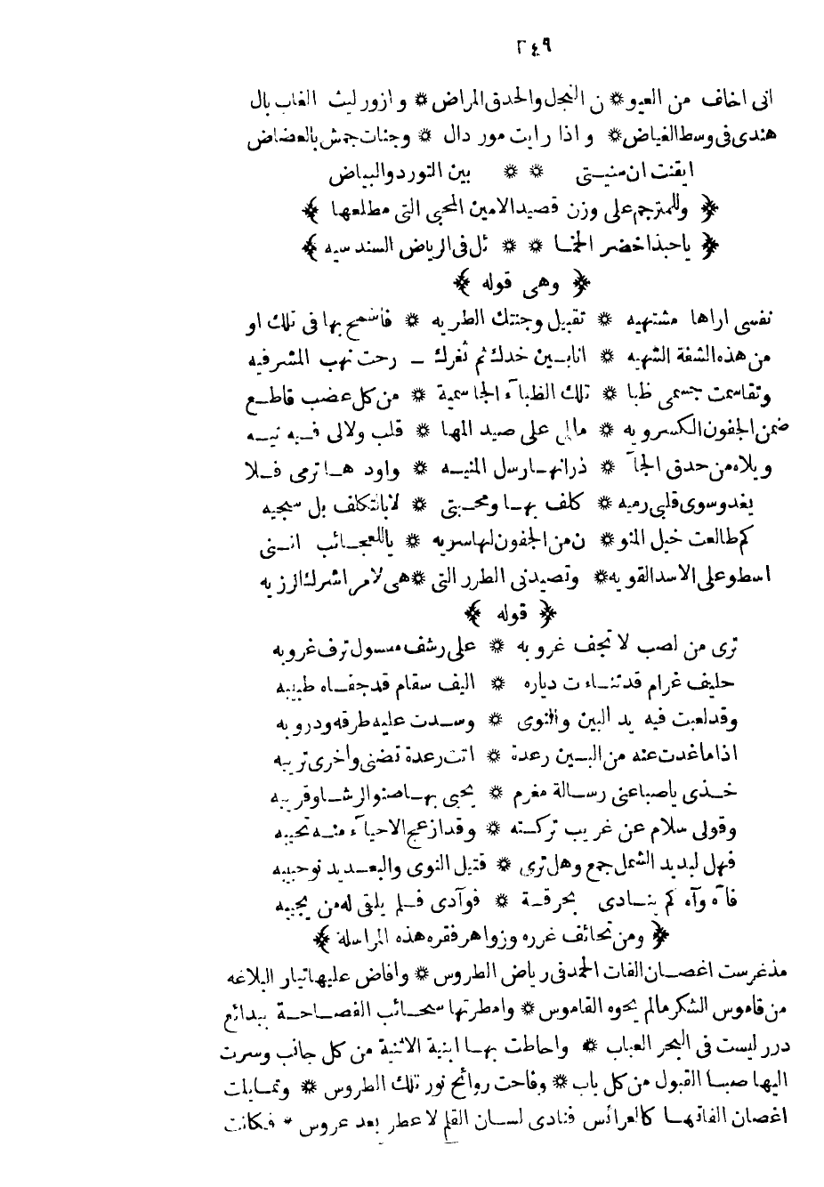ومن تحائف غرره وزواهر فقره هذه المراسلة مذ غرست أغصان الفات الحمد في رياض الطروس وأفاض عليها تيار البلاغة من قاموس الشكر ما لم يحوه القاموس وأمطرتها سحائب الفصاحة ببدائع درر ليست في البحر العباب وأحاطت بها أبنية الأثنية من كل جانب وسرت اليها صبا القبول من كل باب وفاحت روائح نور تلك الطروس وتمايلت أغصان الفاقها كالعرائس فنادى لسان القلم لا عطر بعد عروس فكانت