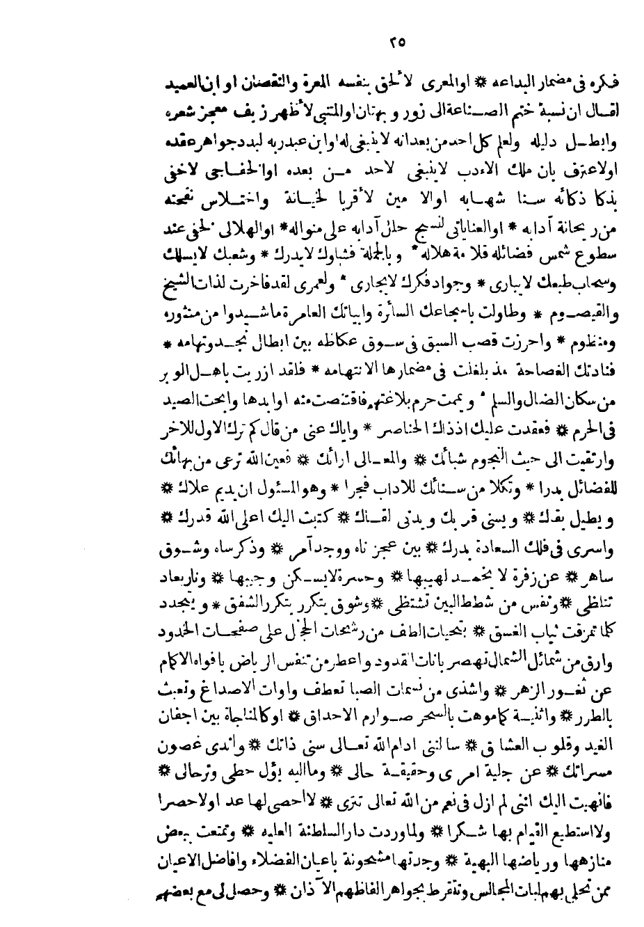 فكره في مضمار البداعة أو المعري لألحق بنفسه المعرة والنقصان أو ابن العميد لقال ان نسبة ختم الصناعة إلي زور وبهتان والمتنبي لأظهر زيف معجز شعره وأبطل دليله ولعلم كل أحد من بعد أنه لا ينبغي له أو ابن عبد ربه لبدد جواهر عقده أو لأعترف بأن ملك الأدب لا ينبغي لأحد من بعده أو الخفاجي لأخفى بذكا ذكائه سنا شهابه أو الأمين لأقربا لخيانة واختلاس نفحته من ريحانة آدابه أو العناياتي لنسج حلل آدابه على منواله أو الهلالي لخفي عند سطوع شمس فضائله قلامة هلاله وبالجملة فشأوك لا يدرك وشعبك لا يسلك وسحاب طبعك لا يباري وجواد فكرك لا يجاري ولعمري لقد فاخرت لذات الشيخ والقيصوم وطأولت بأسجاعك السائرة وأبياتك العامرة ما شيدوا من منثوره ومنظوم وأحرزت قصب السبق في سوق عكاظه بين أبطال نجد وتهامه فنادتك الغاصاحة مذ بلغت في مضمارها الأنتهامه فلقد أزريت بأهل الوبر من سكان الضال والسلم ويممت حرم بلاغتهم فاقتنصت منه أوابدها وأبحت الصيد في الحرم فعقدت عليك اذ ذاك الحناصر واياك عني من قال كم ترك الأول للآخر وارتقيت إلى حيث النجوم شبائك والمعالي أرائك فعين الله ترعى من بهائك للفضائل بدراً وتكلا من سنائك للآداب فجراً وهو المسئول أن يديم علاك ويطيل بقك ويسنى قربك ويدني لقاك كتبت اليك أعلى الله قدرك وأسرى في فلك السعادة يدرك بين عجز ناه ووجد آمر وذكر ساه وشوق ساهر عن زفرة لا يخمد لهيبها وحسرة لا يسكن وجيبها ونار بعاد تتلظى ونفس من شطط البين تشتظي وشوق يتكرر يتكرر الشفق ويتجدد كلما تمزقت ثياب الغسق بتحيات ألطف من رشحات الخجل على صفحات الخدود وأرق من شمائل الشمال تهصر بانات القدود وأعطر من تنفس الرياض بأفواه الأكمام عن ثغور الزهر وأشذى من نسمات الصبا تعطف وأوات الأصداغ وتعبث بالطرر وأثنية كما موهت بالسحر صوارم الأحداق أو كالمناجاة بين أجفان الغيد وقلوب العشاق سألتني أدام الله تعالى سني ذاتك وأندى غصون مسراتك عن جلية أمري وحقيقة حالي وما إليه يؤل حطي وترحالي فأنهيت اليك أنني لم أزل في نعم من الله تعالى تترى لا أحصى لها عداً ولا حصراً ولا أستطيع القيام بها شكراً ولما وردت دار السلطنة العلية وتمتعت ببعض منازهها ورياضها البهية وجدتها مشحونة بأعيان الفضلاء وأفاضل الأعيان ممن تحلى بهم لبات المجالس وتتقرط بجواهر ألفاظهم الآذان وحصل لي مع بعضهم
