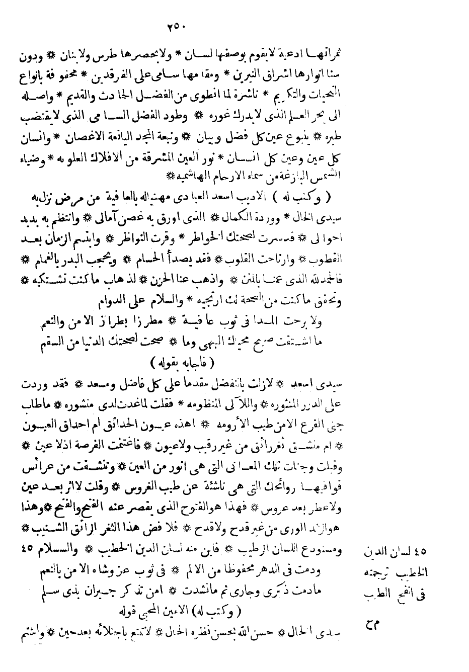 فأجابه بقوله سيدي أسعد لا زلت بالتفضل مقدماً على كل فاضل ومسعد فقد وردت على الدرر المنثوره واللآلي المنظومة فقلت لما غدت لدى منشوره ما طاب جني الفرع الا من طيب الأرومه أهذه عيون الحدائق أم أحداق العيون أم منشق ثغر رائق من غير رقيب ولا عيون فاغتنمت الفرصة إذ لا عين وقبلت وجنات تلك المعاني التي هي أنور من العين وتنشقت من عرائس قوافيها روائحك التي هي ناشئة عن طيب الغروس وقلت لا أثر بعد عين ولا عطر بعد عروس فهذا هو الفتوح الذي يقصر عنه الفتح والفتح وهذا هو الزند الورى من غير قدح ولا قدح فلا فض هذا الثغر الرائق الشنيب ومستودع اللسان الرطيب فأين منه لسان الدين الخطيب والسلام