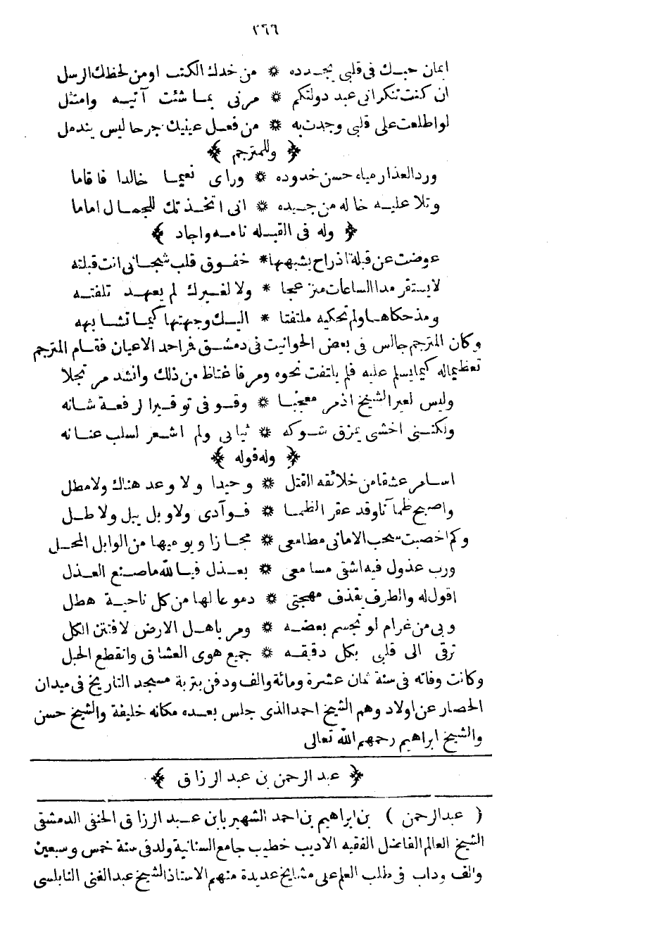 عبد الرحمن بن إبراهيم بن أحمد الشهير بابن عبد الرزاق الحنفي الدمشقي الشيخ العالم الفاضل الفقيه الأديب خطيب جامع السنانية ولد في سنة خمس وسبعين وألف ودأب في طلب العلم على مشايخ عديدة منهم الاستاذ الشيخ عبد الغني النابلسي