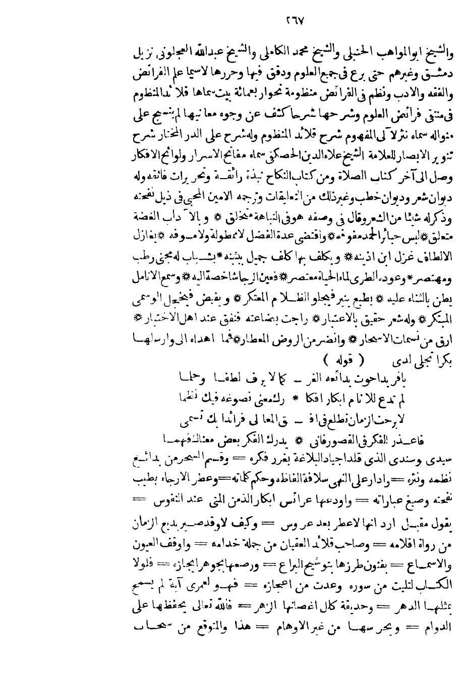 والشيخ أبو المواهب الحنبلي والشيخ محمد الكاملي والشيخ عبد الله العجلوني نزيل دمشق وغيرهم حتى برع في جميع العلوم ودقق فيها وحررها لا سيما علم الفرائض والفقه والأدب ونظم في الفرائض منظومة نحو أربعمائة بيت سماها قلائد المنظوم في منتقي فرائض العلوم وشرحها شرحاً كشف عن وجوه معانيها لم ينسج على منواله سماه نثر لآلي المفهوم شرح قلائد المنظوم وله شرح على الدر المختار شرح تنوير الأبصار للعلامة الشيخ علاء الدين الحصكفي سماه مفاتح الأسرار ولوائح الأفكار وصل إلى آخر كتاب الصلاة ومن كتاب النكاح نبذة رائقة وتحريرات فائقه وله ديوان شعر وديوان خطب وغير ذلك من التعليقات وترجمه الأمين المحبي في ذيل نفحته وذكر له شيئاً من الشعر وقال في وصفه هو في النباهة متخلق وبالآداب الغضة متعلق لبس حبائر الحمد مفوفه واقتضى عدة الفضل لا ممطولة ولا مسوفه يغازل الألطاف غزل ابن اذينه ويكلف بها كلف جميل ببثينة بشباب له مجني رطب ومهتصر وعوده الطري لماء الحياة معتصر فعين الرجا شاخصة إليه وسمع الأنامل يطن بالثناء عليه بطبع ينير فيجلو الظلام المعتكر ويفيض فيخجل الوسمي المبتكر وله شعر حقيق بالاعتبار راجت بضاعته فنفق عند أهل الأختبار أرق من نسمات الأسحار وانضر من الروض المعطار فمما أهداه إلي وأرسلها بكراً تجلى لدي قوله
