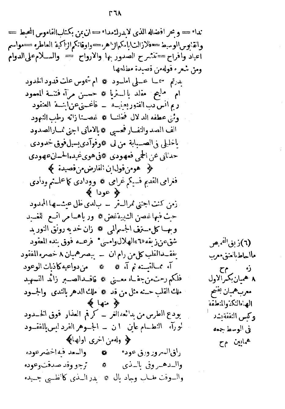 نداه وبحر أفضاله الذي لا يدرك مداه إن يمن بكتاب القاموس المحيط والقابوس الوسيط فلا زالت أيامكم الزاهرة وأوقاتكم الزاكية العاطرة مواسم أعياد وأفراح تنشرح الصدور بها والأرواح والسلام على الدوام ومن شعره قوله من قصيدة مطلعها