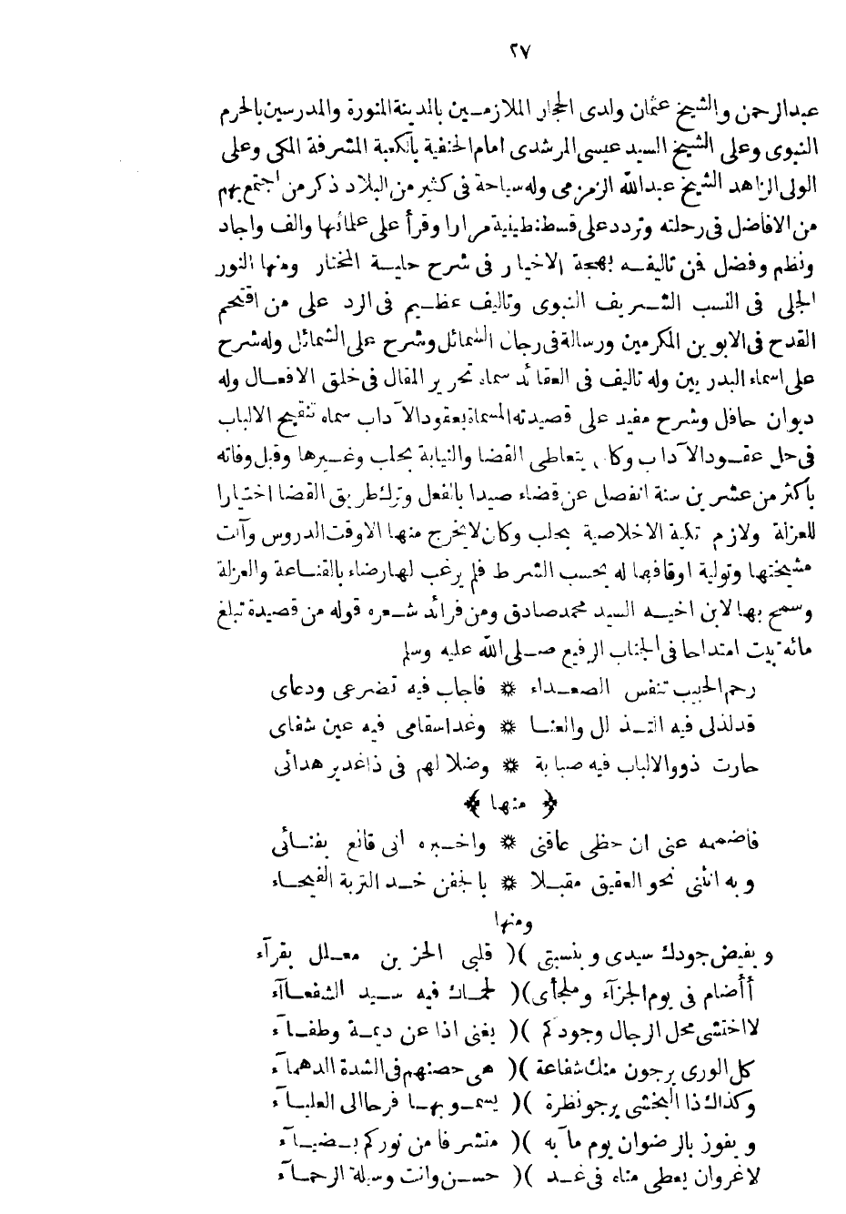 عبد الرحمن والشيخ عثمان ولدي الحجار الملازمين بالمدينة المنورة والمدرسين بالحرم النبوي وعلى الشيخ السيد عيسى المرشدي امام الحنفية بالكعبة المشرفة المكي وعلى الولي الزاهد الشيخ عبد الله الزمزمي وله سياحة في كثير من البلاد ذكر من اجتمع بهم من الأفاضل في رحلته وتردد على قسطنطينية مراراً وقرأ على علمائها وألف وأجاد ونظم وفضل فمن تأليفه بهجة الخيار في شرح حلية المختار ومنها النور الجلي في النسب الشريف النبوي وتأليف عظيم في الرد على من اقتحم القدح في الأبوين المكرمين ورسالة في رجال الشمائل وشرح على الشمائل وله شرح على أسماء البدريين وله تأليف في العقائد سماه تحرير المقال في خلق الأفعال وله ديوان حافل وشرح مفيد على قصيدته المسماة بعقود الآداب سماه تنقيح الألباب في حل عقود الآداب وكل يتعاطى القضا والنيابة بحلب وغيرها وقبل وفاته بأكثر من عشرين سنة انفصل عن قضاء صيدا بالفعل وترك طريق القضا اختياراً للعزلة ولازم تكية الاخلاصية بحلب وكان لا يخرج منها الا وقت الدروس وآلت مشيختها وتولية أوقافها له بحسب الشرط فلم يرغب لها رضاء بالقناعة والعزلة وسمح بها لأبن أخيه السيد محمد صادق ومن فرائد شعره قوله من قصيدة تبلغ مائة بيت امتداحاً في الجناب الرفيع صلى الله عليه وسلم
