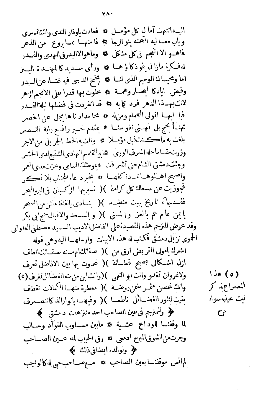 وقد عرض المترجم هذه القصيدة على الفاضل الأديب السيد مصطفى العلواني الحموي نزيل دمشق فكتب له هذه الأبيات وأرسلها إليه وهي قوله