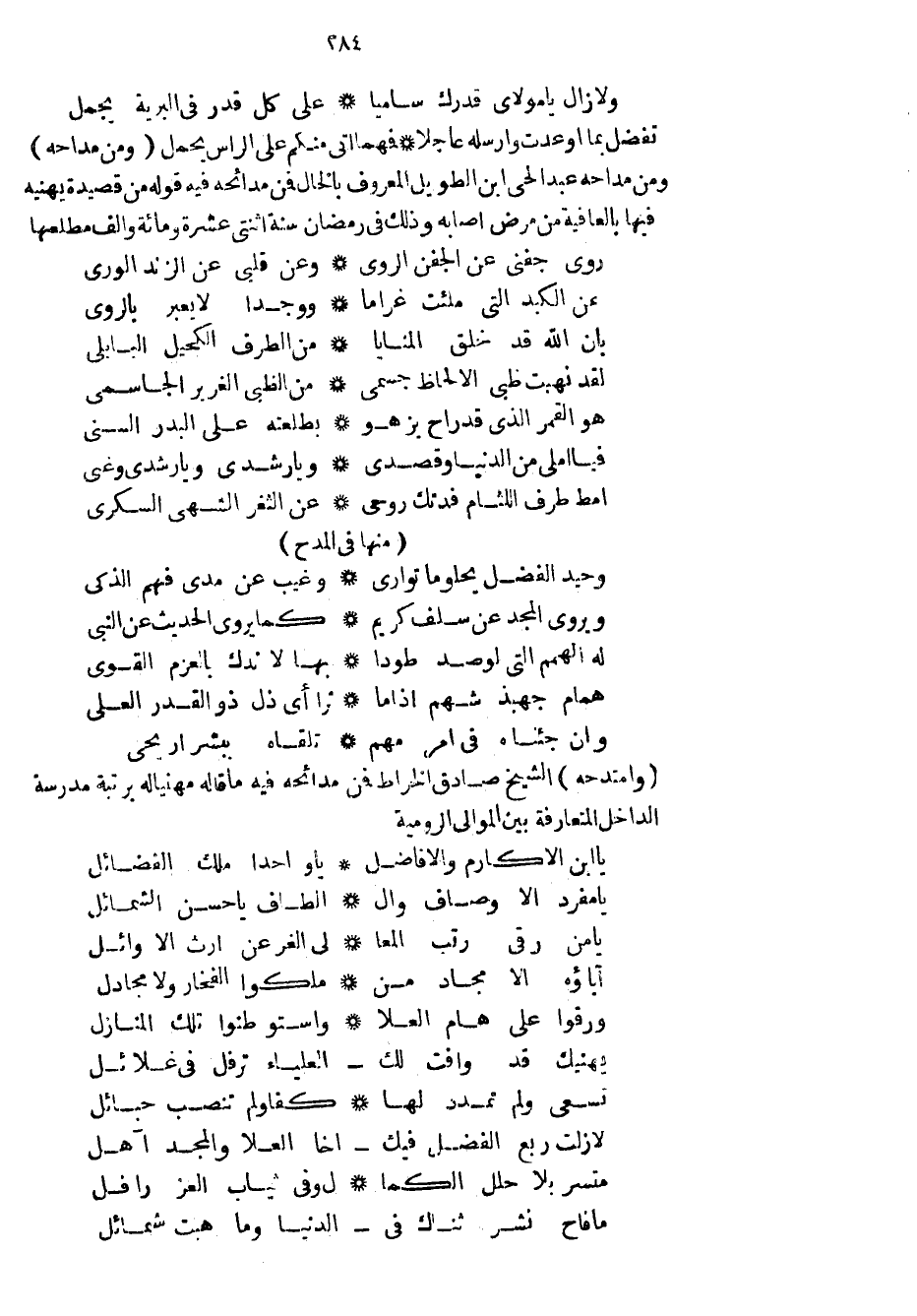 وامتدحه الشيخ صادق الخراط فمن مدائحه فيه ما قاله مهنياً له برتبة مدرسة الداخل المتعارفة بين المولى الرومية